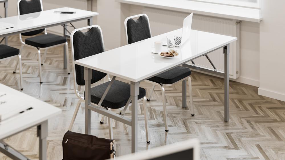 Ljudisolerande bordsskiva i vitt med svart kant som finns i olika storlekar. Bordsskiva med ljuddämpande skiva för konferenslokaler och festlokaler.
