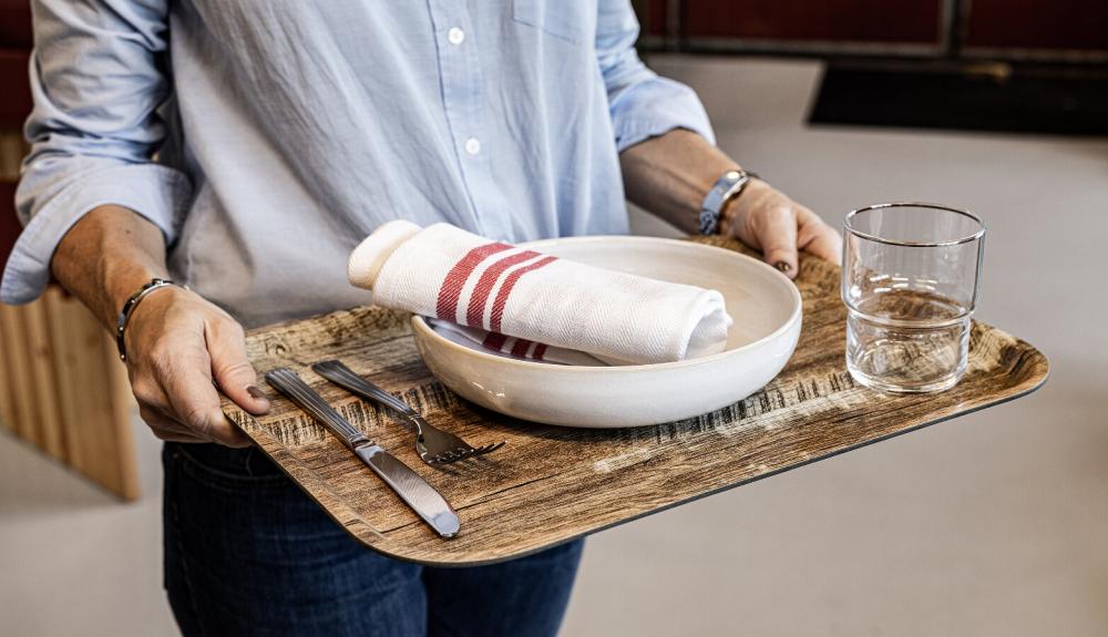 Bricka med kant i ljus träimitation som har enkel och elegant utseende men samtidigt är funktionell då det finns nonslip yta.
