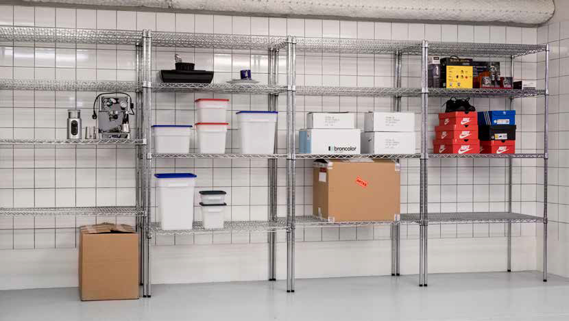 Förvaringshylla i aluminium med avtagbara hyllplan av plast för enkel rengöring. En hylla som är utbyggbar och har hög kapacitet per hyllplan.