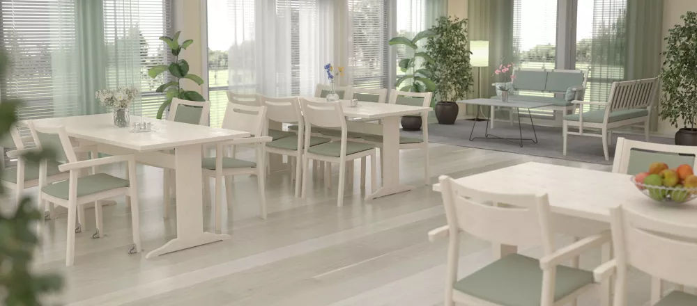 Ester bord 170x120 cm från Inoff. Bord med iläggskiva som ingår i en serie som är anpassad för vårdmiljöer och innehåller flera sittmöbler och bord.