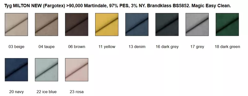 Klädselval som är standard och oftast finns fler färger i varje klädselval. Det går även i många fall att välja fler klädselval som inte är standard. Kontakta oss för mer information om klädselvalen.