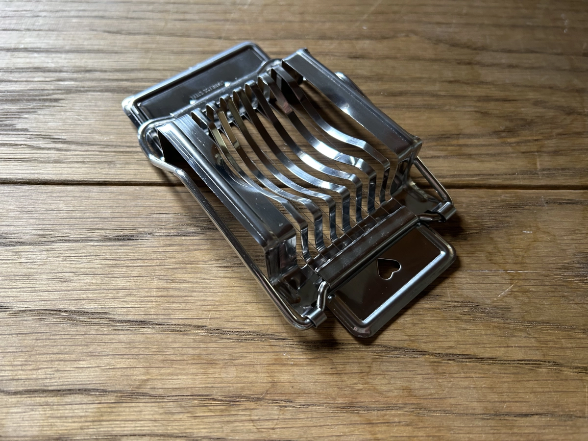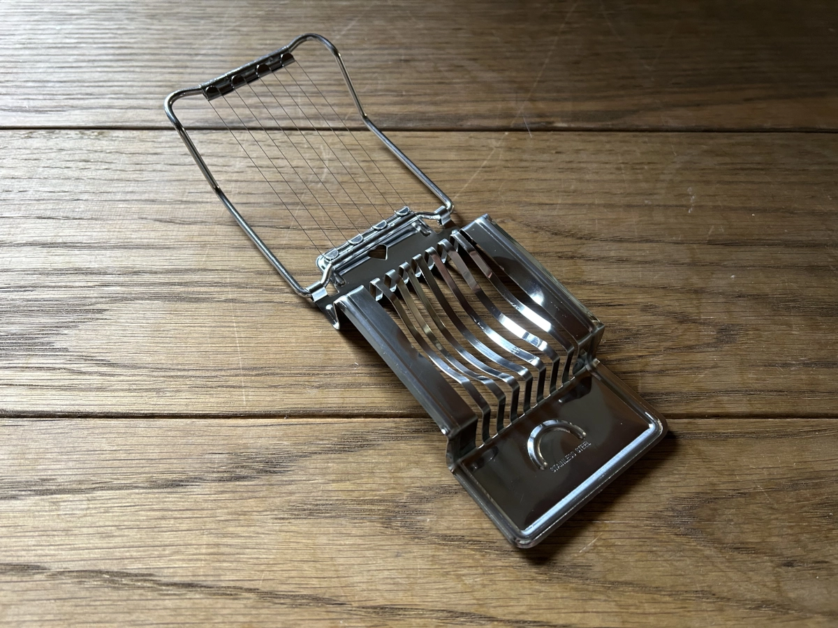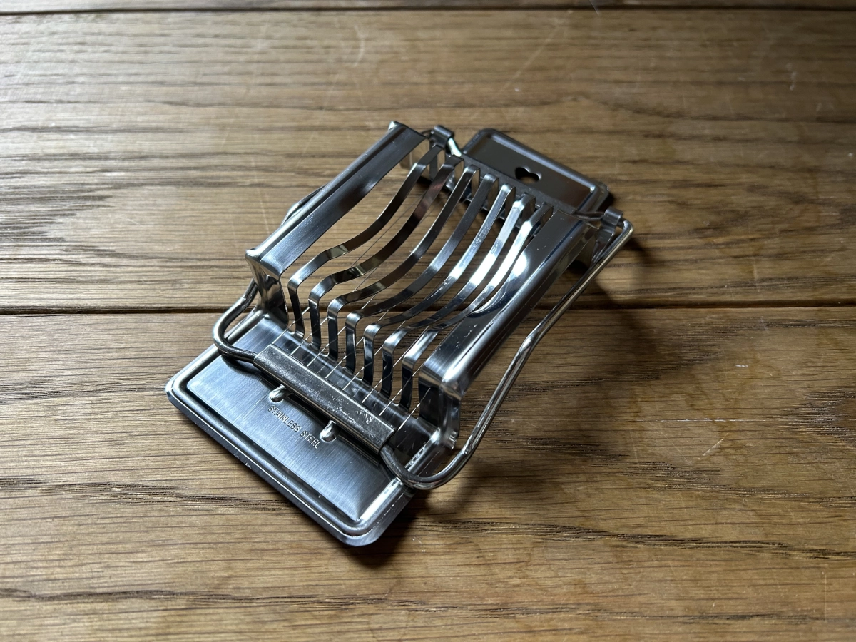 Äggskivare av rostfritt stål som har en rektangulär form och enkelt skivar kokt ägg som även är ett köksredskap som passar bra i olika kök.
