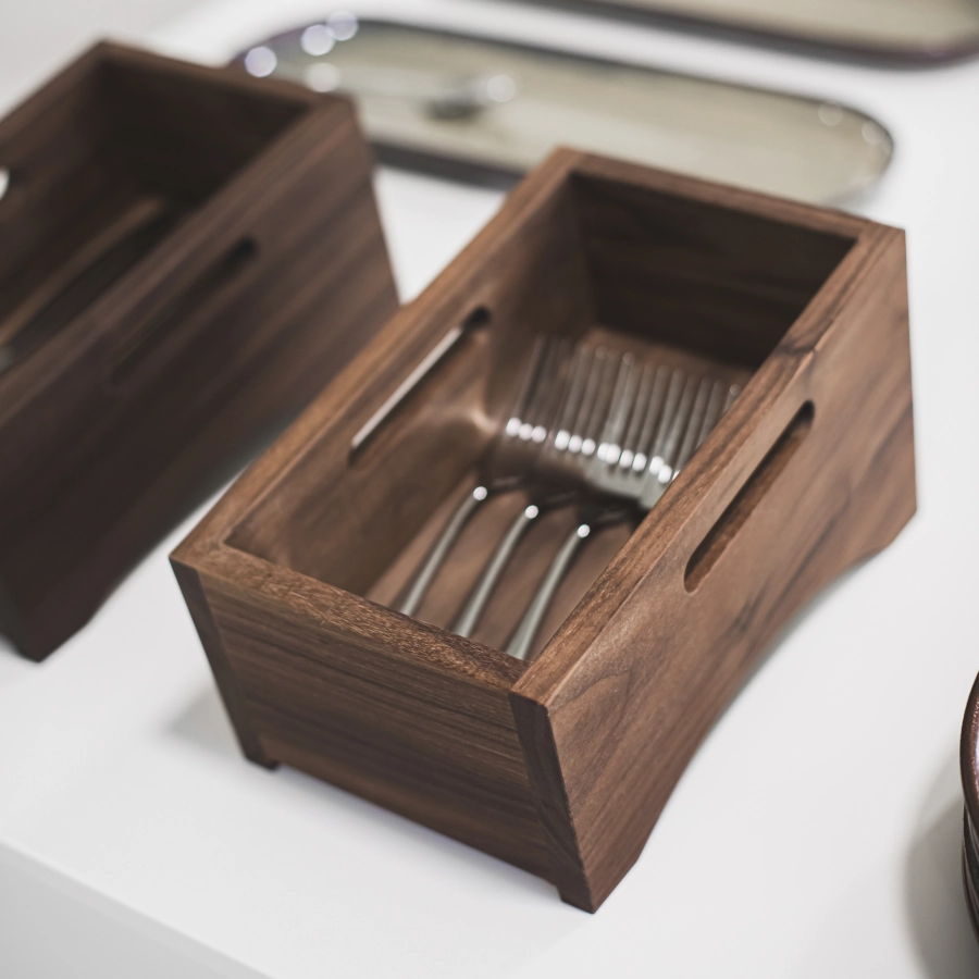 Besticklåda av ek som är lutande och finns i olika färger. En bestickslåda som ingår i en serie där olika träprodukter finns.
