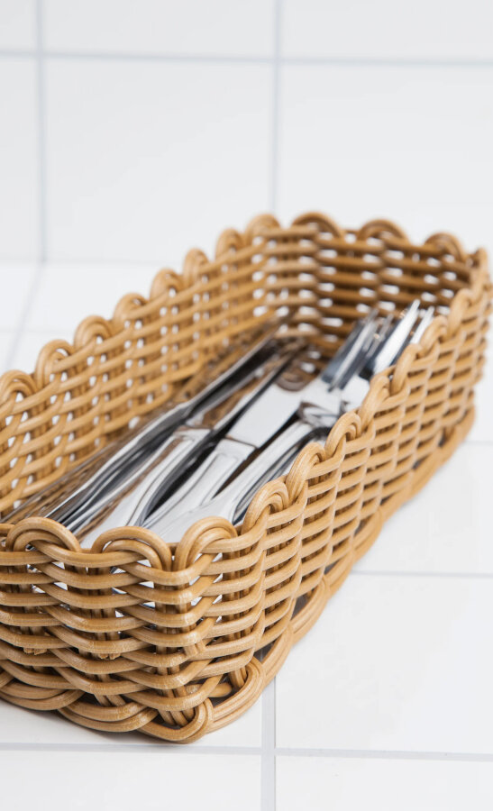 Bestickskorg i brun färg som är flätad av 3 mm polypropylen tråd. En praktisk bestickskorg med rektangulär form som kan användas som bestickkorg men även intressant till annat också. Det är även enkelt att rengöra bestickkorgen och den kan ställas fram vid buffén eller i matsalen.