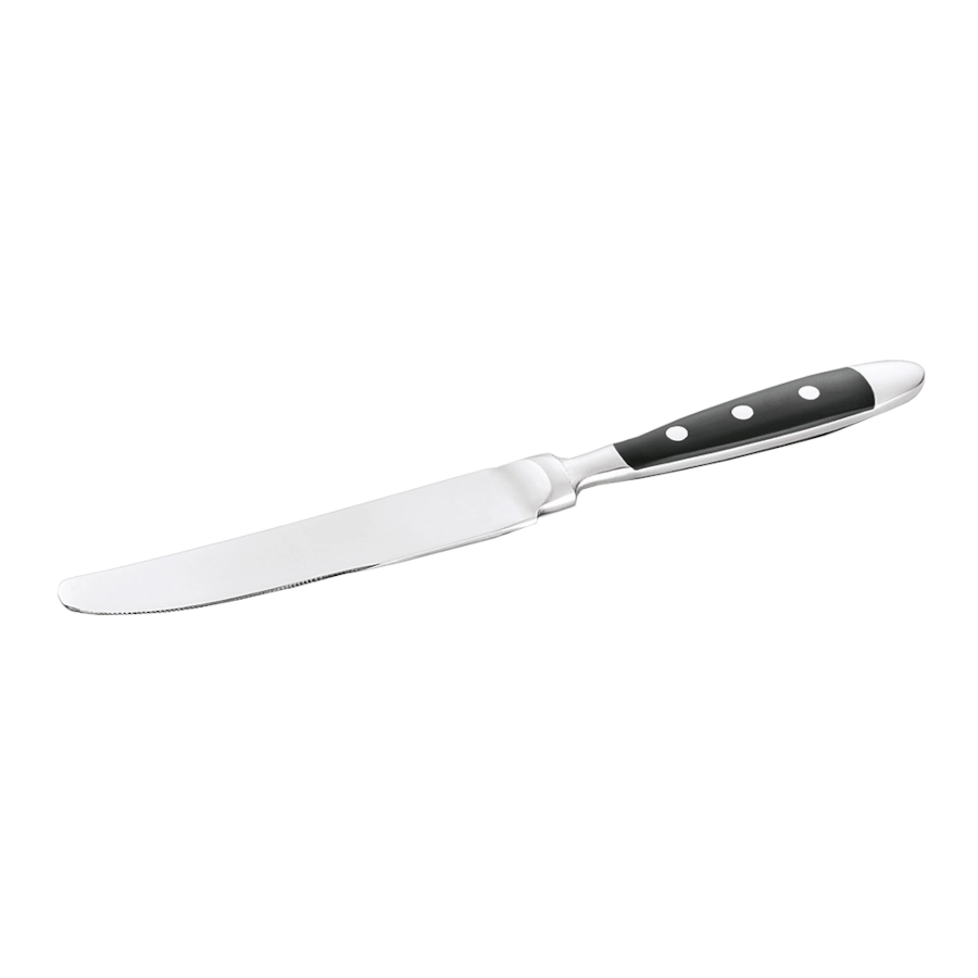 Bistro Classic bordskniv av rostfritt stål med handtag av plast som har dekorativa nitar och ingår i serien Bistro Classic. I serien Bistro Classic finns flera bestick som är robusta och har en klassisk men även rustik stil med speciell bistro charm. Besticken i serien har även en vikt och rundad form som gör serien extra behaglig att hålla.