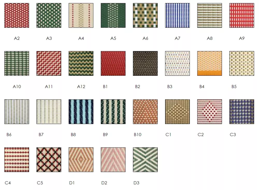 Det vanligaste är att man väljer samma färg på snörningar (nylonförstärkningarna) och för bakgrundsfärgen i mönstret på sitsen och ryggen. Därefter att man har en annan färg på dekoren (prickar) i mönstret på sitsen och ryggen.