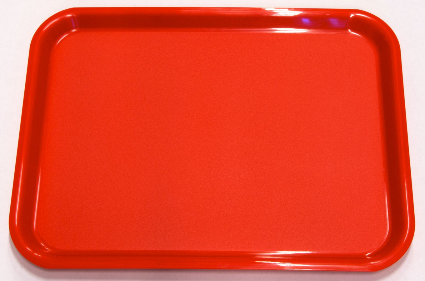 Bricka som är som är svensktillverkad av slagtålig propenplast med ljusröd färg.