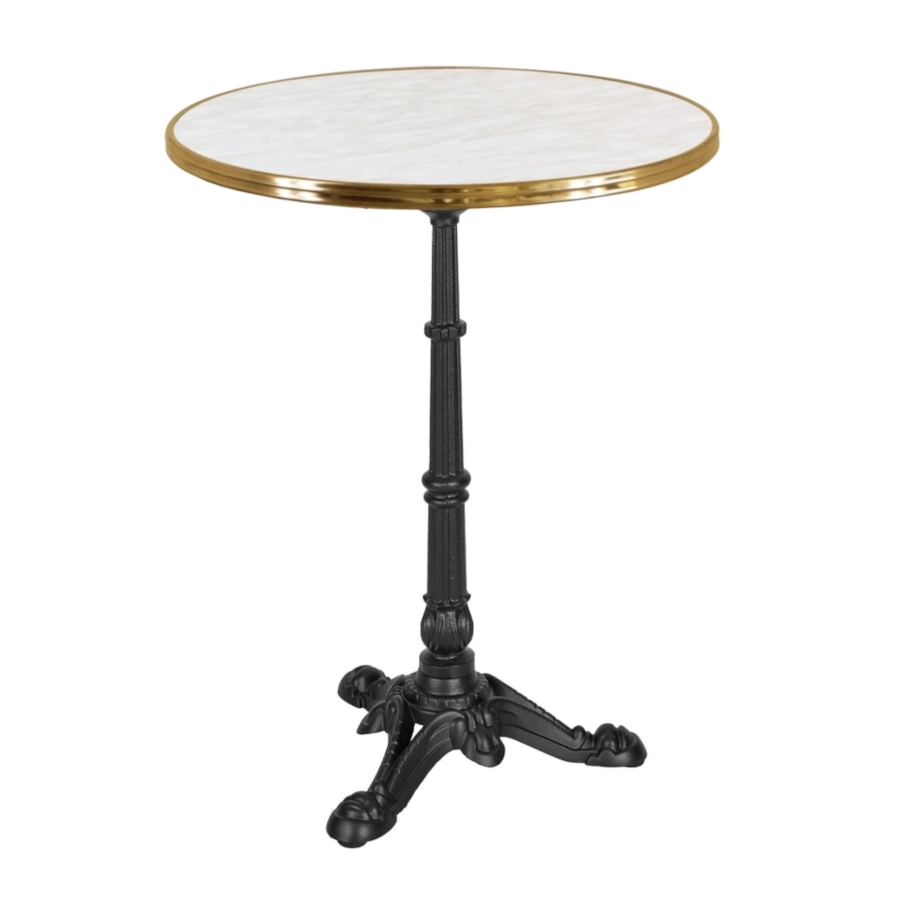 Classic Bistro bord med klassiskt dekorativt gjutjärnsstativ ihop med bordsskiva med marmorliknande dekor som har mässingkant.