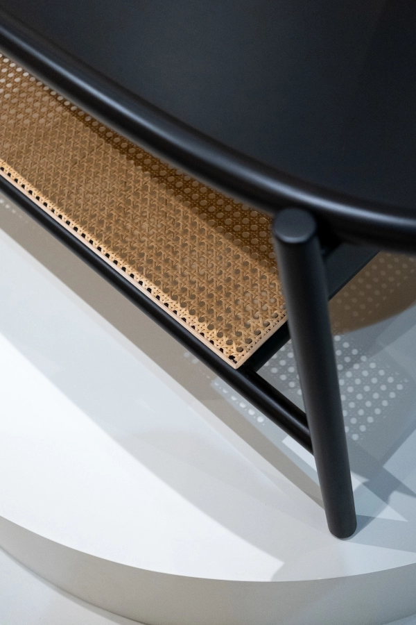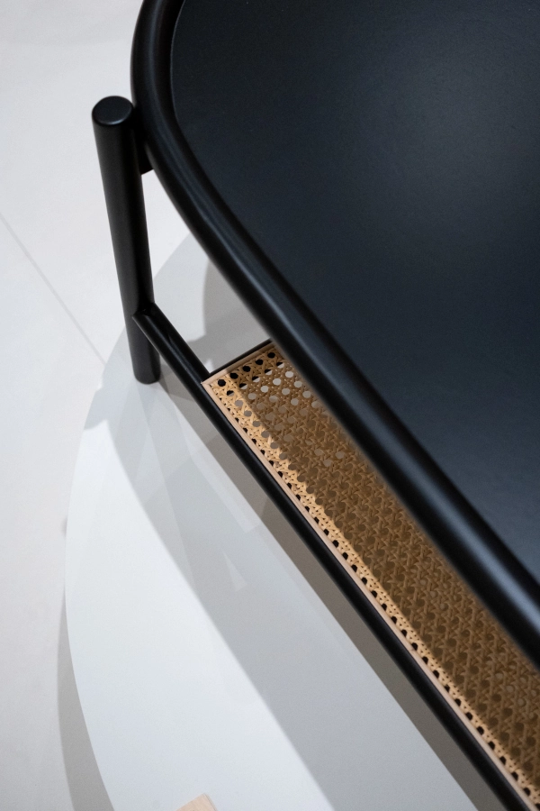 Bordets nedre hylla är tillverkad av naturlig vävning och sträckt över en träram som förlitar sig på exakt spänning för att behålla sin struktur, ungefär som det på en trumma. Denna spänningen är avgörande för dess hållbarhet och fungerar även som inspiration till namnet på bordet. Serien Drum är designad för att att vara mångsidig och har en böjträkant som ramar in bordsskivan, medan den vävda ytan under fungerar som en elegant luftig hylla.