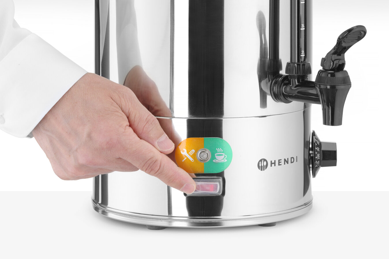 Elektrisk dryckesvärmare med droppfri tappkran som rymmer 9 liter och i ett polerat utförande. En värmare som har behållare och handtag som är tillverkat av rostfritt stål. Det är dubbla isolerade väggar som minskar värmeförlusten upp till ca 20 % jämfört med liknande som bara har en vägg.