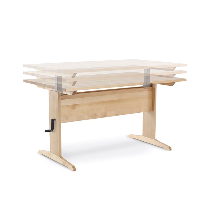 Man justerar höjden med en handdriven vev och det går att justera höjden med 15 cm. Det medföljer en stödregel som monteras under bordsskivan.