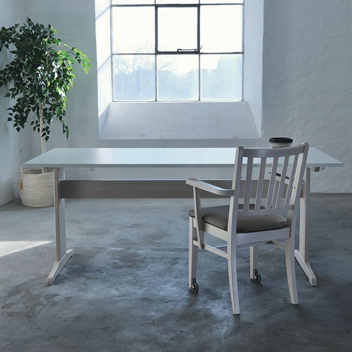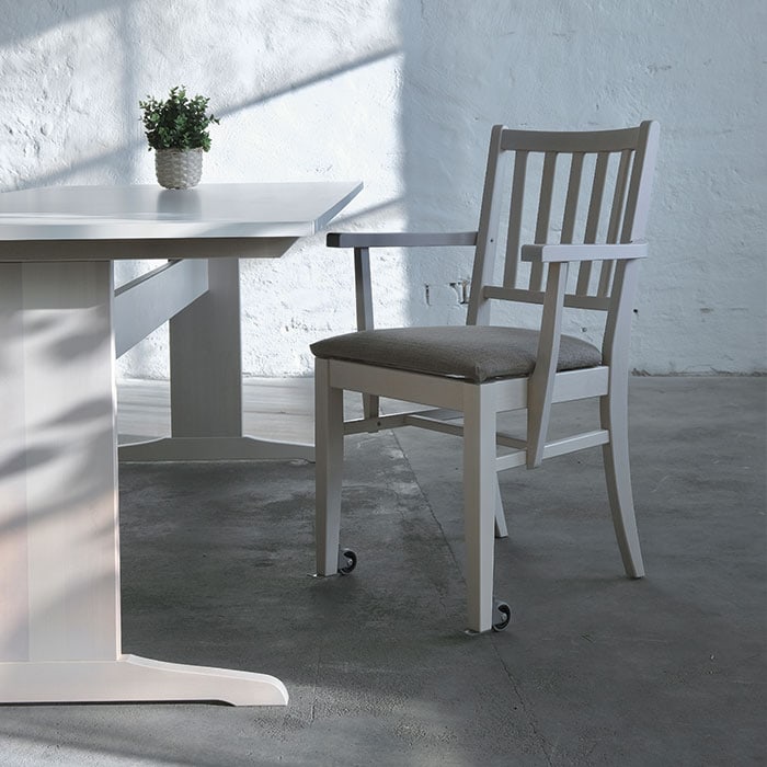 Med den här karmstolen får man en tålig och stabil stol där armstöden ger bra avlastning. Sitsen har fast urinväv som i sin tur träs över med en basker av tyg. Vid konstläder eller läder då spikas det fast istället. Den här karmstolen har även glidhjul som gör att det är enklare att förflytta stolen.