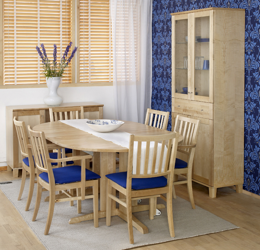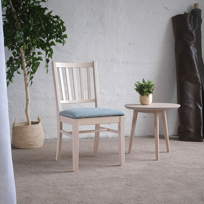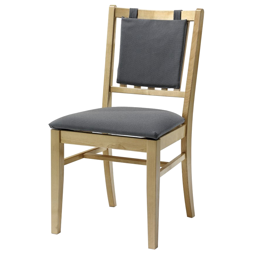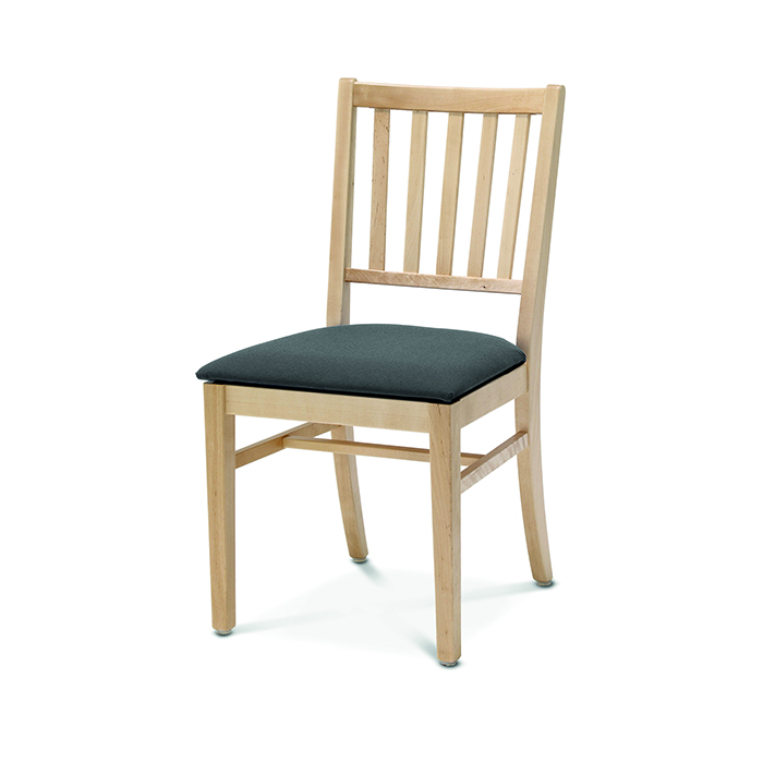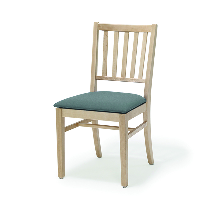 Denna stol är tillverkad av björk med klädd sits som kan väljas i olika färger och klädselval. Vid projekt då finns även fler klädselval men även möjligt att få olika täckande lacker i olika färger. Det finns även extra lack för desinfektionsmedel.