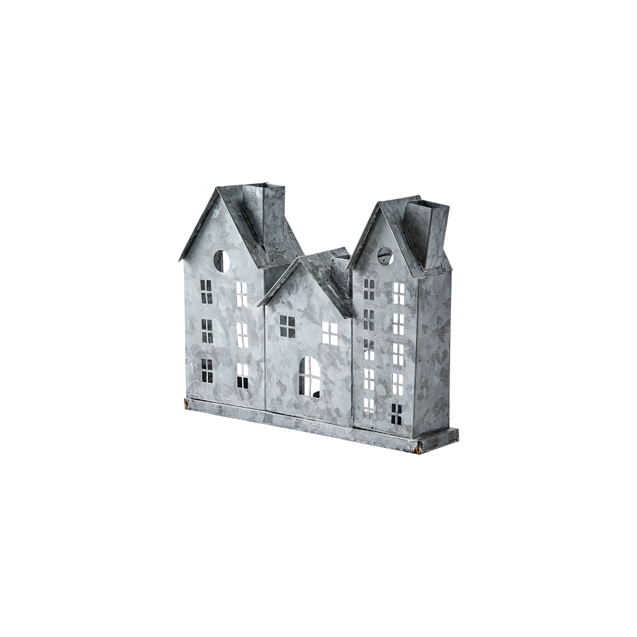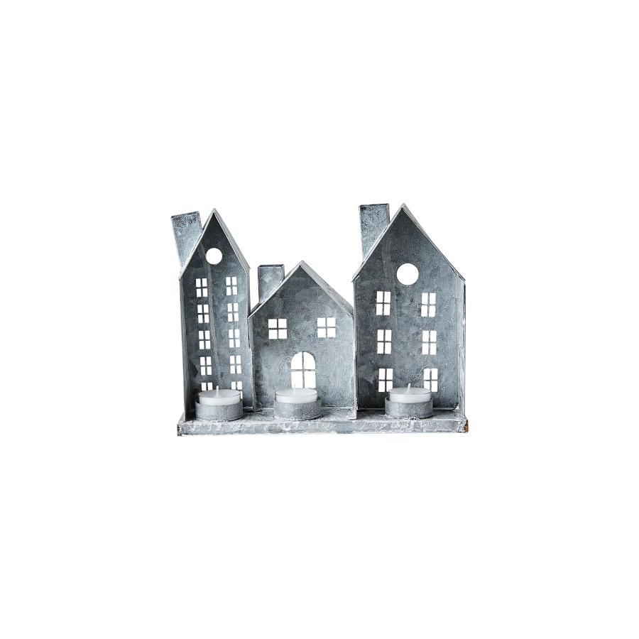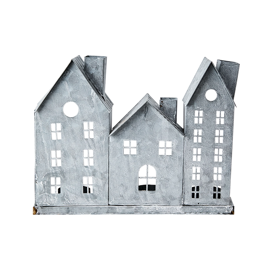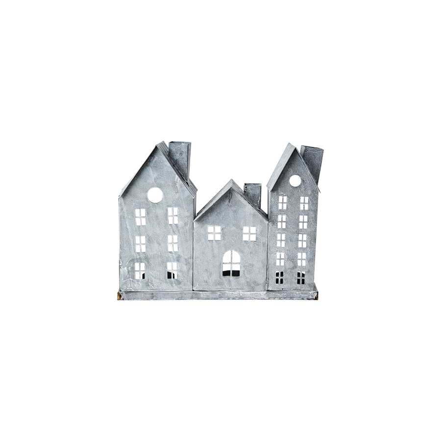 Ljuslykta hus Fenix med 3 hus i rad av järn i grå/vit som är dekorativ men även ger ett vackert ljus och ger en mysig atmosfär till sin miljö.