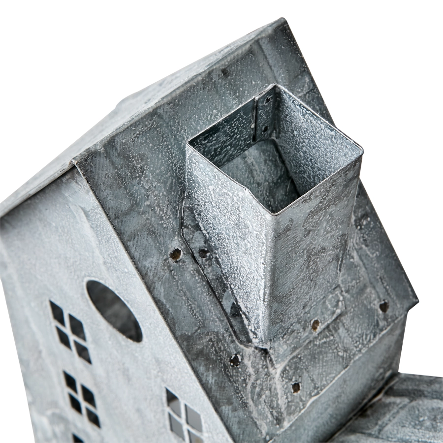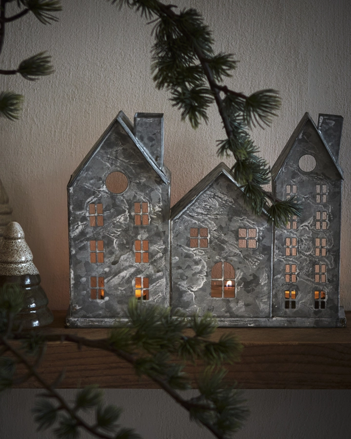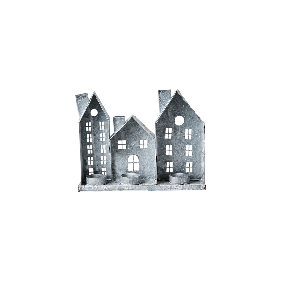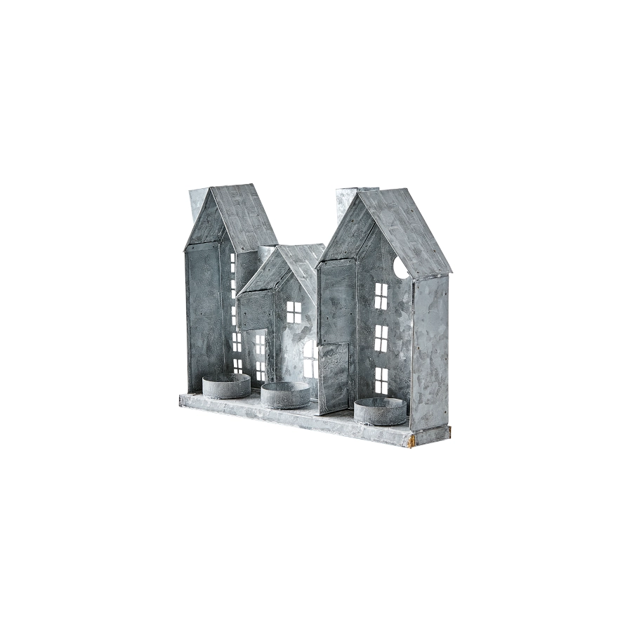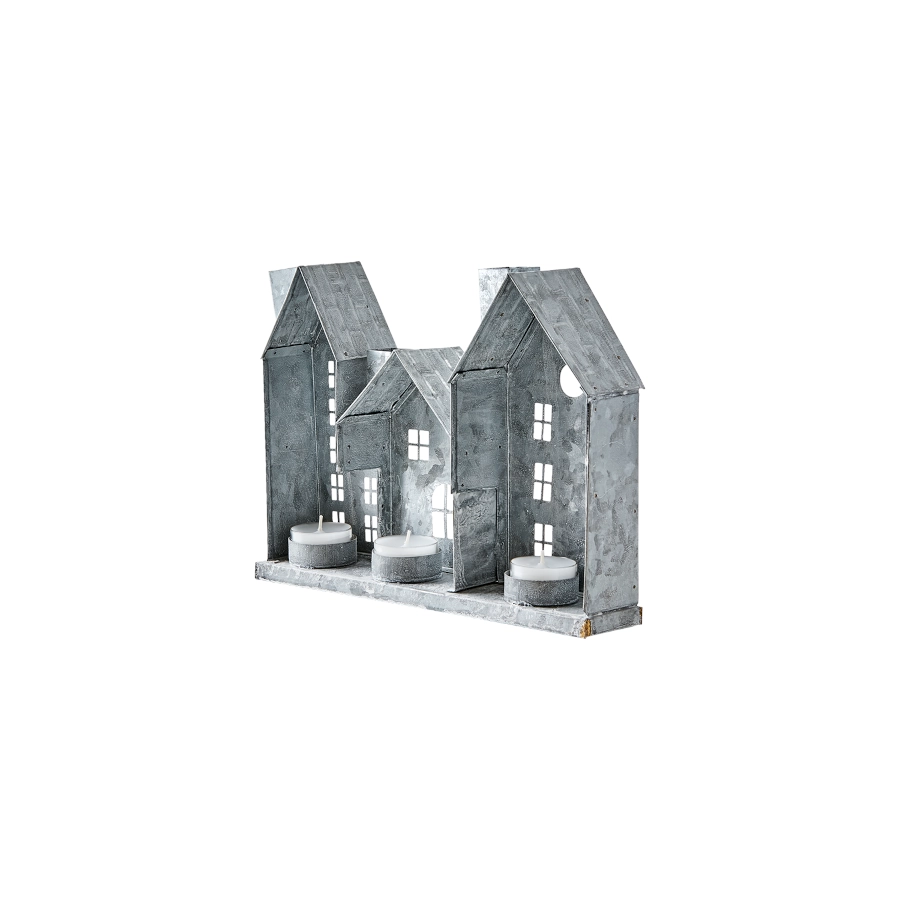Ljuslykta hus Fenix med 3 hus i rad av järn i grå/vit som är dekorativ men även ger ett vackert ljus och ger en mysig atmosfär till sin miljö.