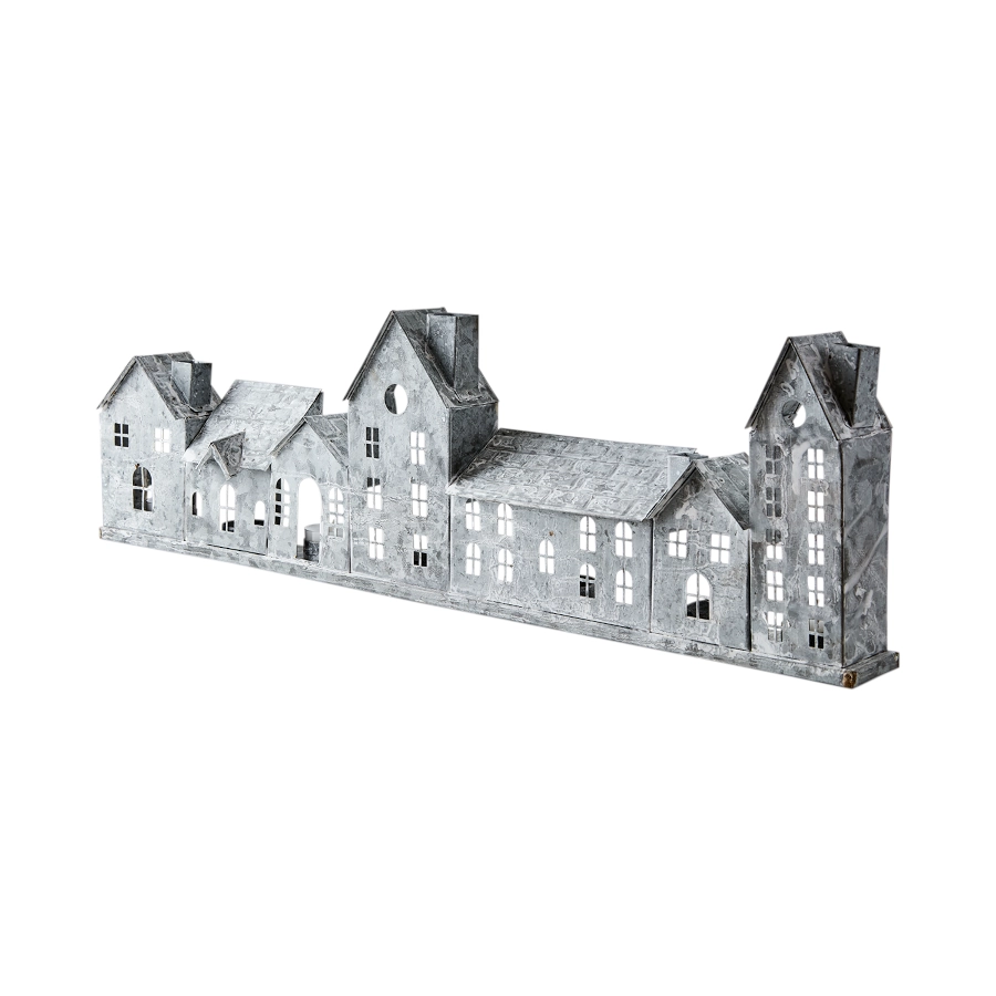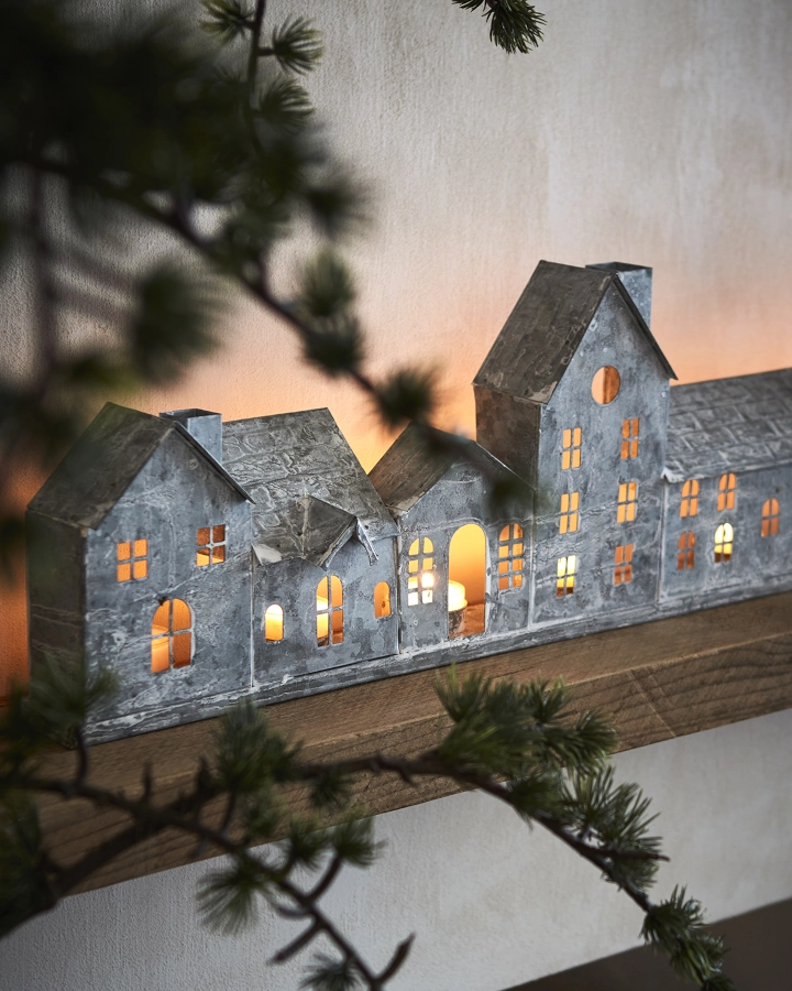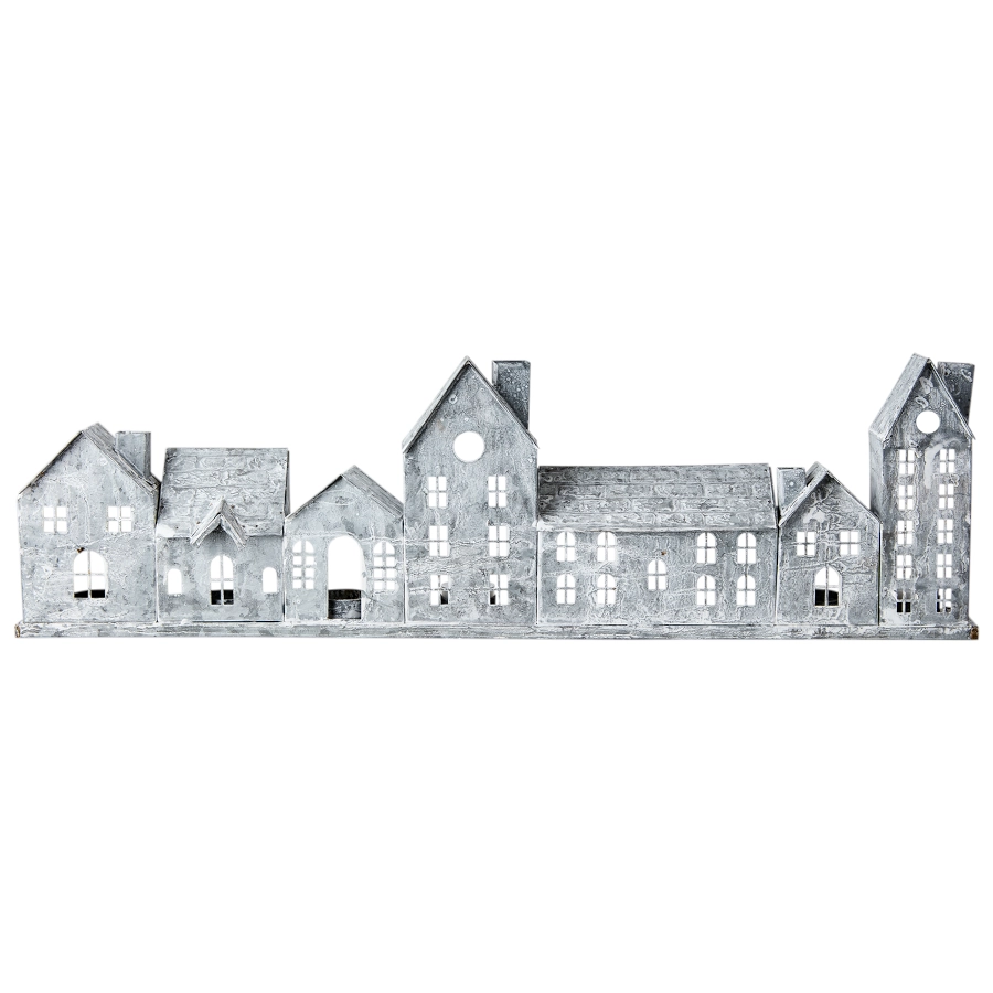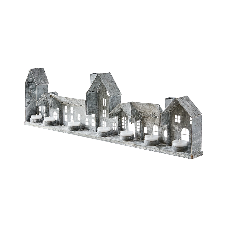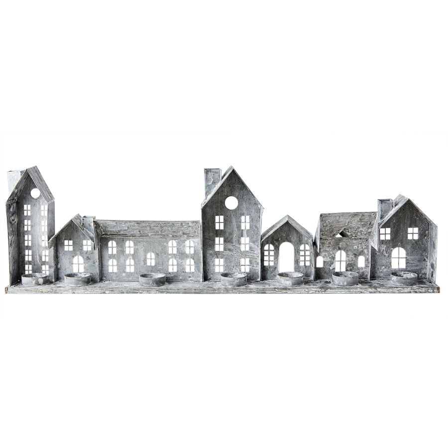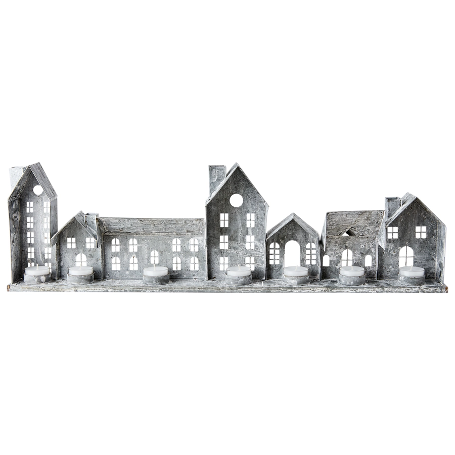 Ljuslykta hus Fenix med 7 hus i rad av järn i grå/vit som är dekorativ men även ger ett vackert ljus och ger en mysig atmosfär till sin miljö.