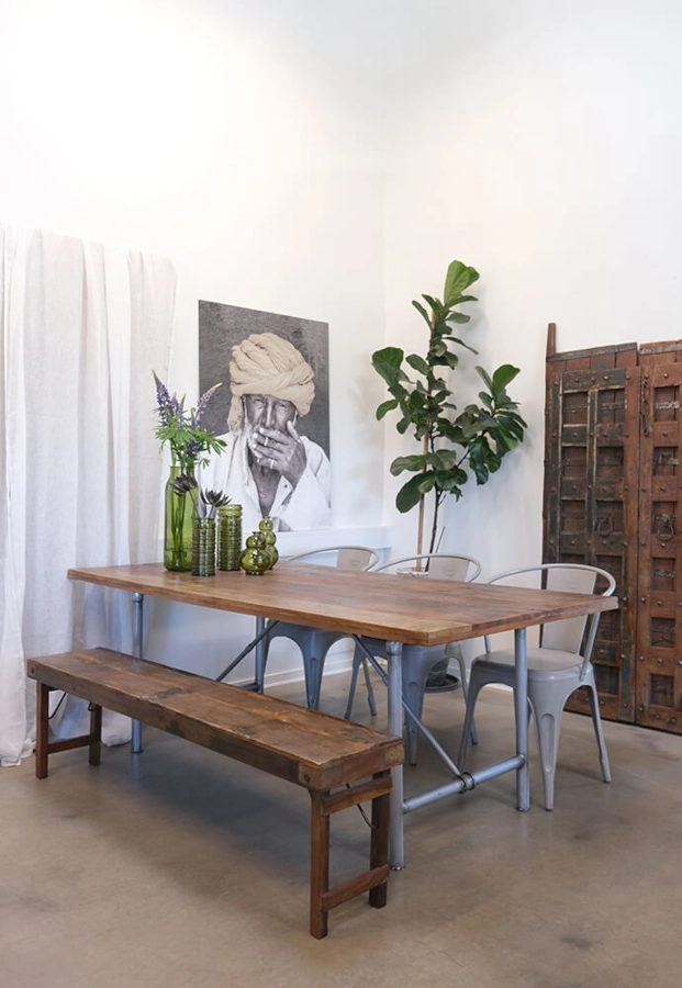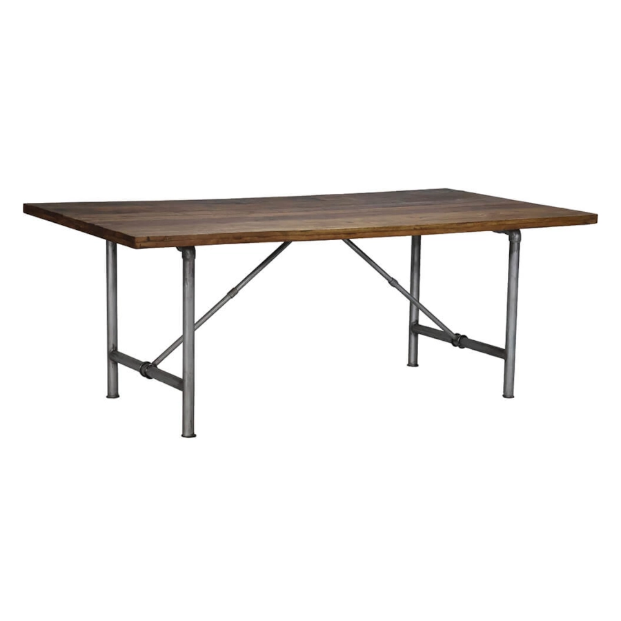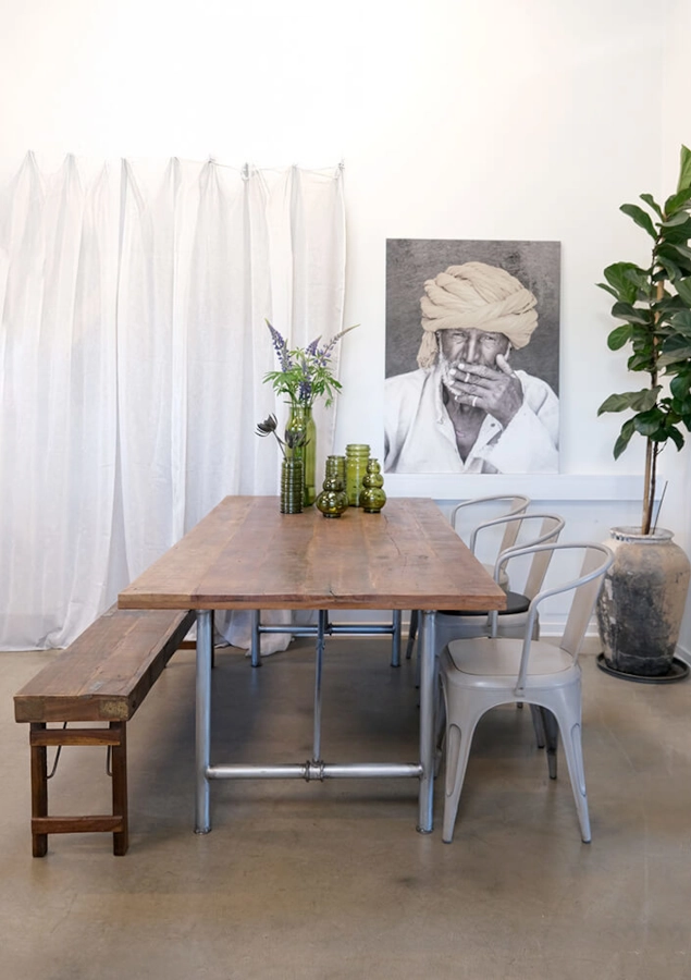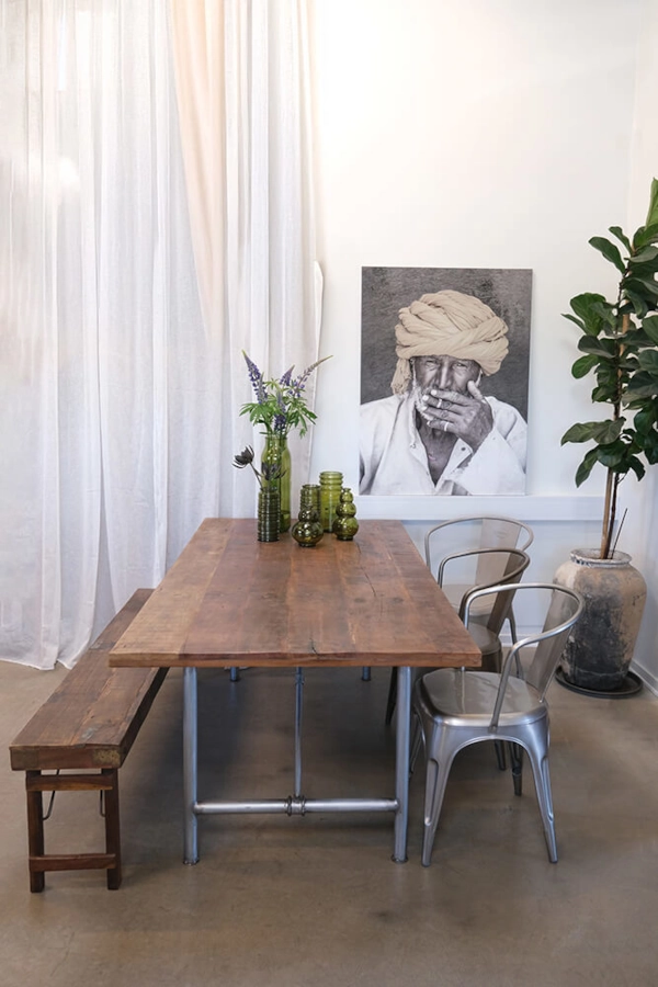 Garacharma matbord har bordsskiva som är tillverkad av återvunnet trä och stativ av robusta järnrör vilket ger ett rustikt men även industriellt utseende. Bordsskivans trä har naturlig patina som framhäver bordet autentiska karaktär vilket ger charm till sin inredning och miljö. De rustika bordsbenen bidrar både till att ge bordet stabilitet och framöver den rustika och maskulina designen.