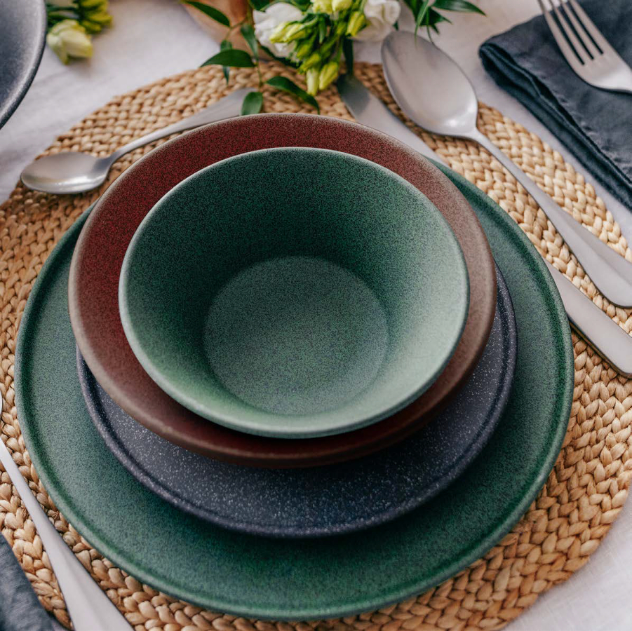 Granit flat tallrik som är tillverkad av porslin med verde grön melerad färg som heter no 3 raw/rå.