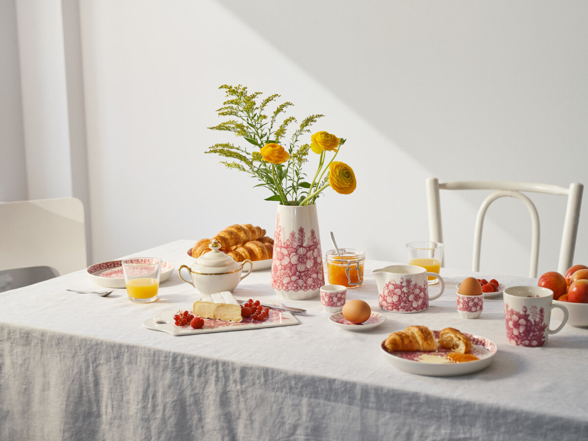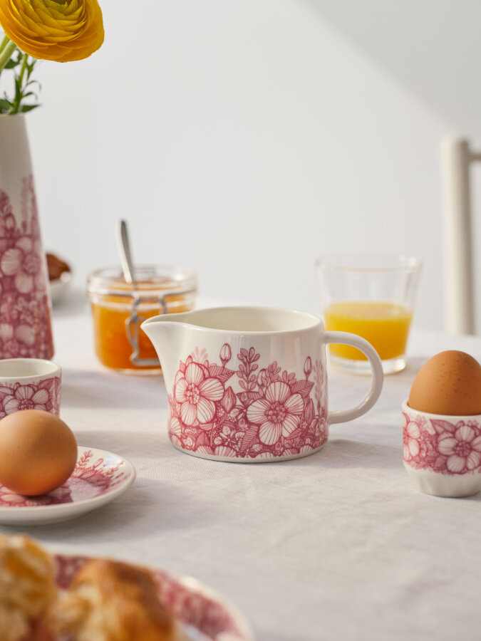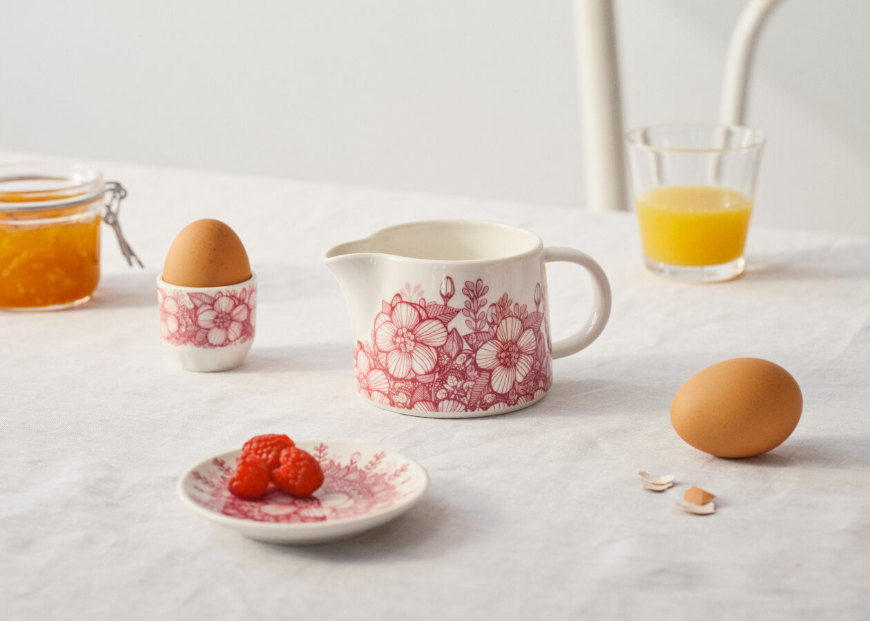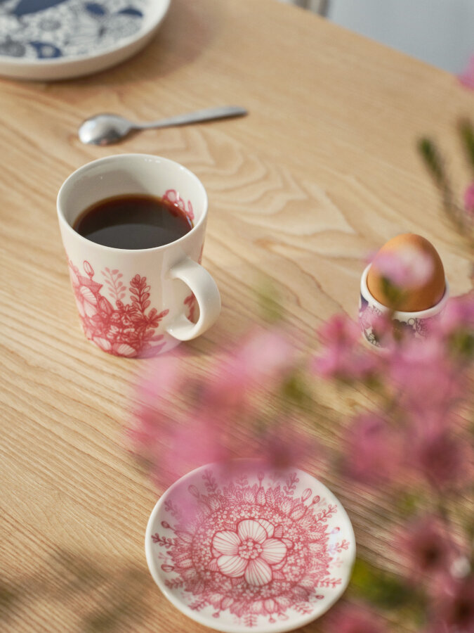 Med Heini Riitahuhta typiska handritningsstil skapas ett modernt och spännande blommigt mönster med vildrosor men även känslan av 1920-talet och gamla Arabia. I serien Huvila finns flera olika delar som kan användas var för sig eller ihop.