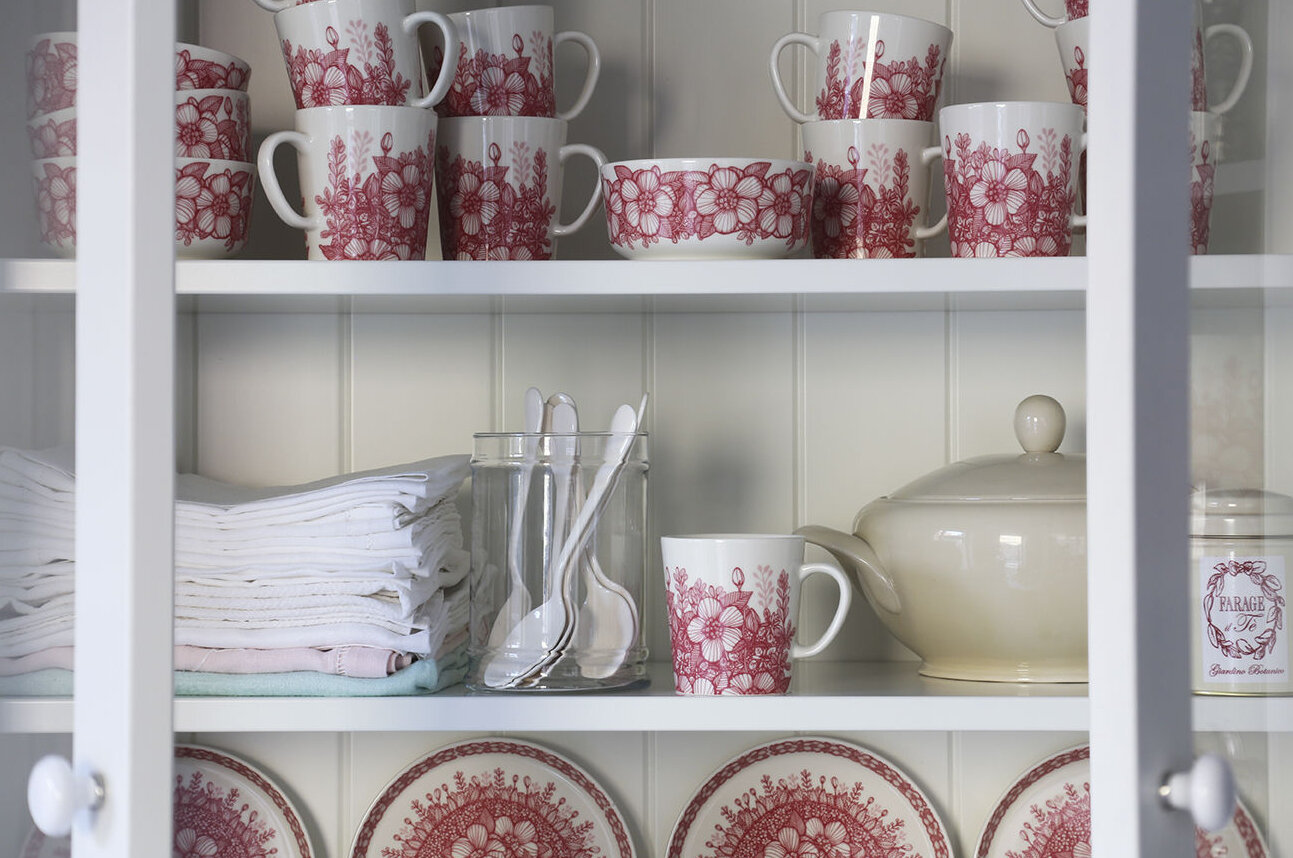Huvila mugg med blommig dekor som ingår i serien Huvila som är skapad av finska designern och keramikern Heini Riitahuhta. Inspiration till serien har hämtats från hennes barndomsminnen av sin mormors lusthus och atmosfären som fanns där.