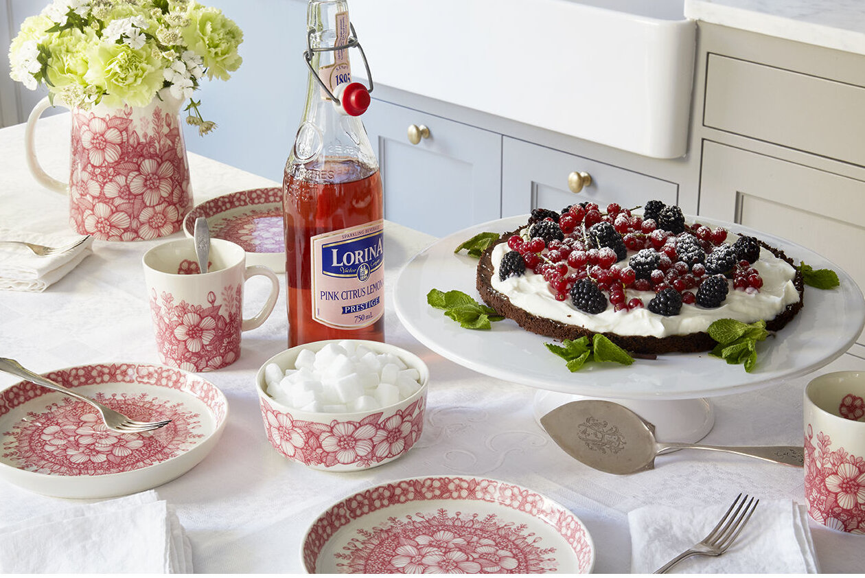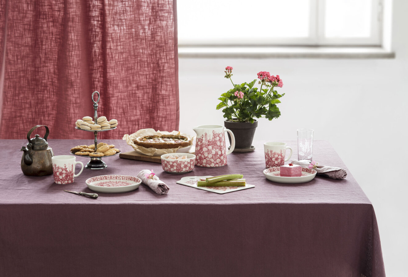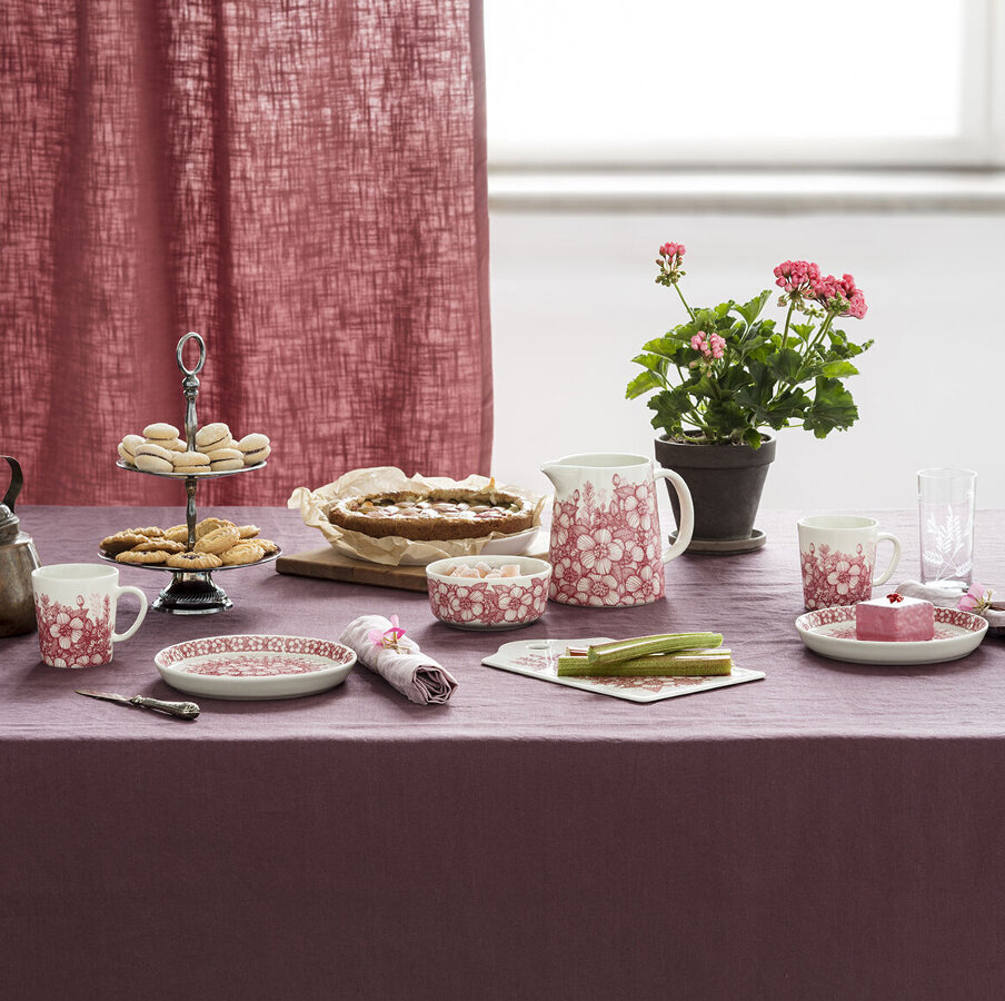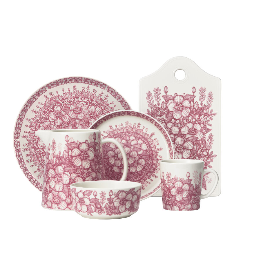 Med Heini Riitahuhta typiska handritningsstil skapas ett modernt och spännande blommigt mönster med vildrosor men även känslan av 1920-talet och gamla Arabia. I serien Huvila finns flera olika delar som kan användas var för sig eller ihop.
