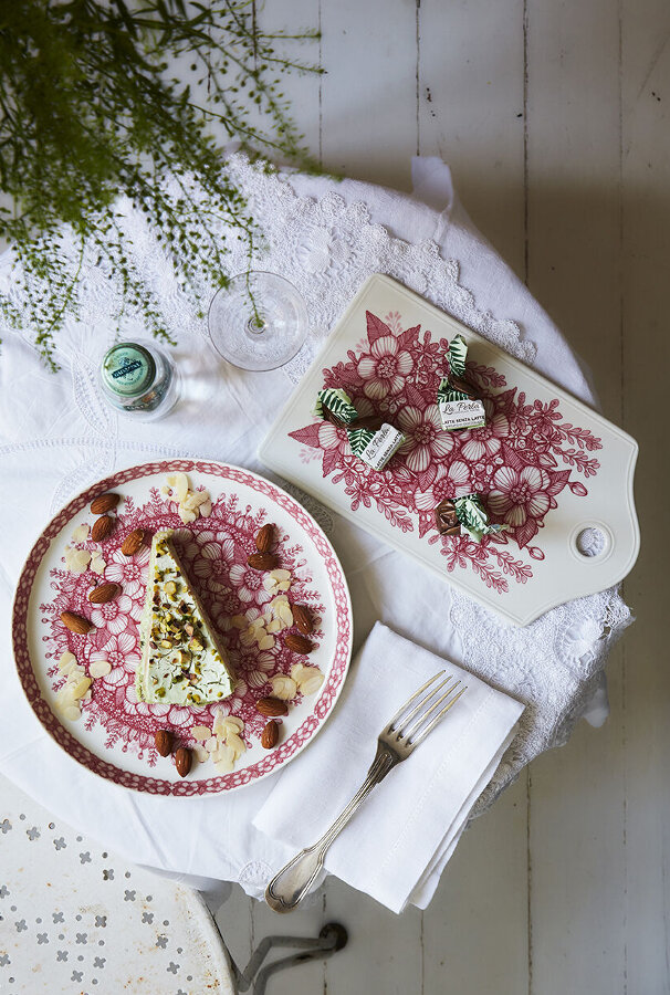 Huvila tallrik med blommig dekor som ingår i serien Huvila som är skapad av finska designern och keramikern Heini Riitahuhta. Inspiration till serien har hämtats från hennes barndomsminnen av sin mormors lusthus och atmosfären som fanns där.