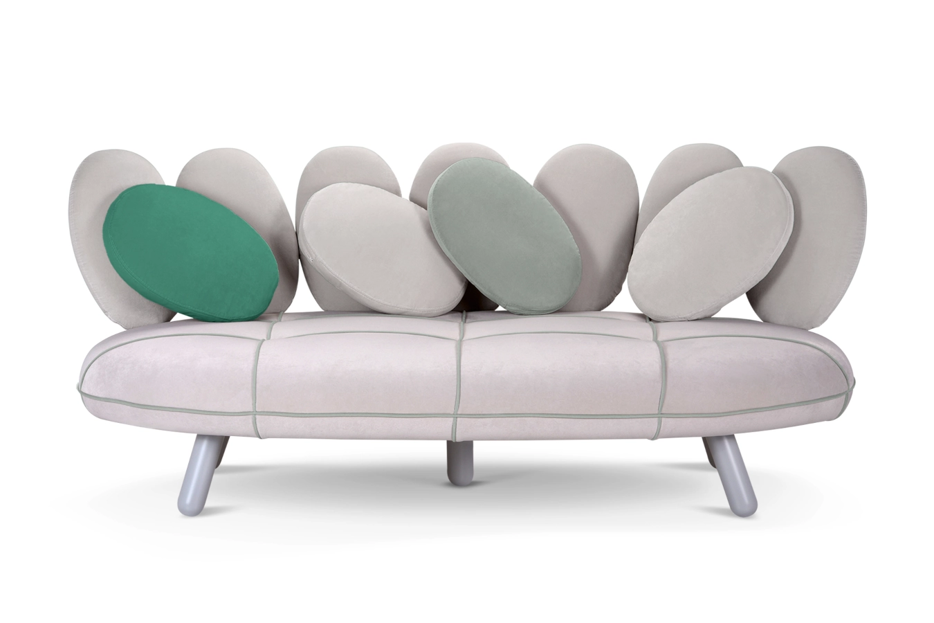 Med sin spännande design får man en inbjudande soffa som består av en fast kuddrad baktill och där det är lösa kuddar framtill. Det går att välja att få soffan i olika klädselval som gör att soffan kan få olika utseenden. Man kan även välja om man vill att soffan kläs i samma tygfärg för ett mer stilrent utseende eller i olika tygfärger som då gör att soffan får ett mer kreativt utseende.