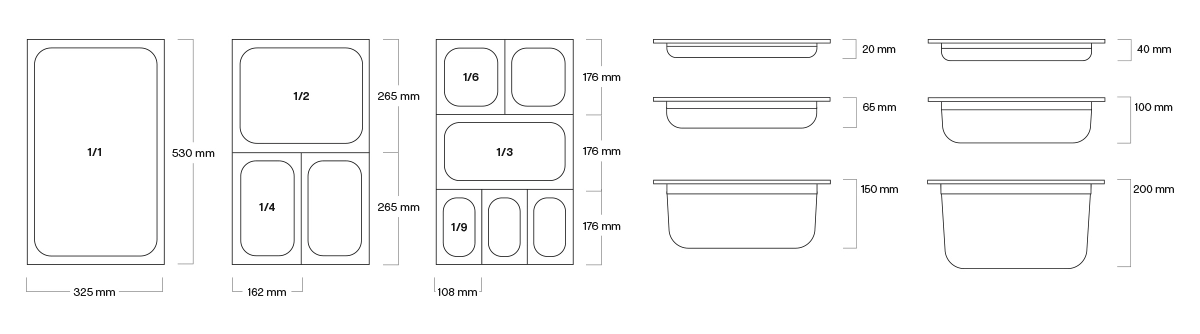 Här kan man se olika GN gastronormstorlekar men även hur de olika storlekarna kan kombineras.