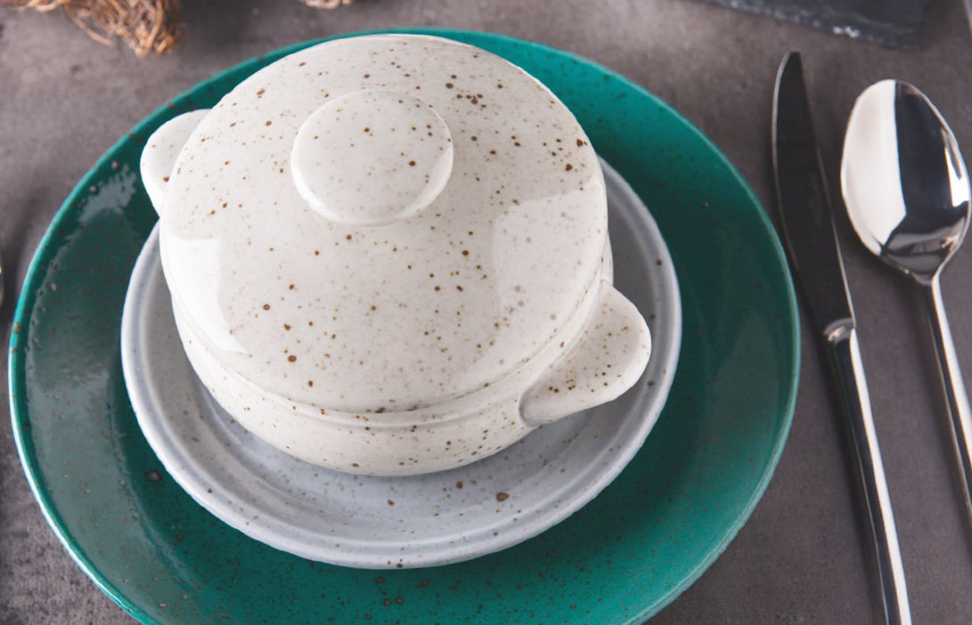 Lifestyle soppskål med 2 handtag som har färgen Natural. En skål som passar bra som soppskål i cafe, restaurang och i ett hem.