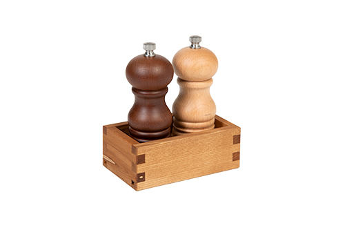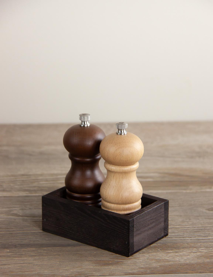 Den här trälådan kan man ha på det dukade bordet och som har plats för 2 kryddkvarnar som kan vara max 5,4 diameter cm stora. Trälåda som passar lika bra i i cafe, restaurang som i ett hem.