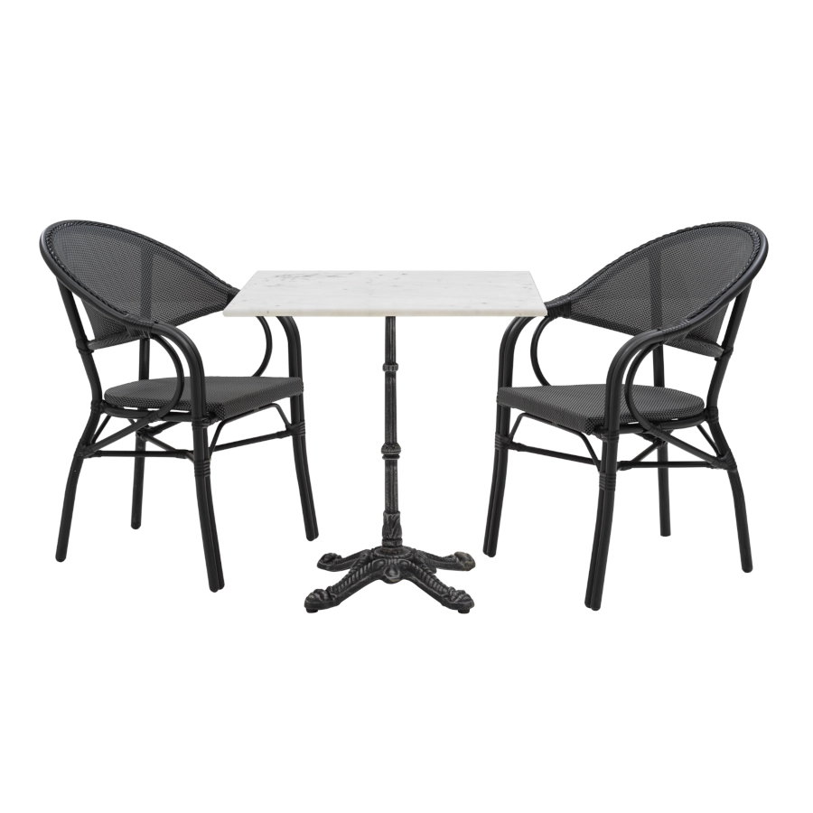 Loire cafébord med gjutjärnsstativ och fyrkantig marmorskiva. Marmorbord som är ett bra cafebord, restaurangbord, matbord och trädgårdsbord.