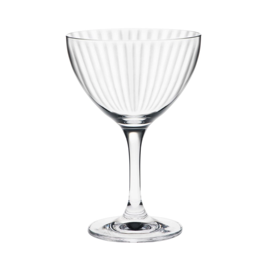 Med glasets dekorativa kupa får man en extra visuell effekt som ger extra stil till glaset. Den vackra Optic designen på glaset finns även på andra glas som kan användas ihop eller var för sig i barer, restauranger som i ett hem. Det är även ett glas som är intressant till olika drycker som martinis, cocktails och champagne och mousserande viner.