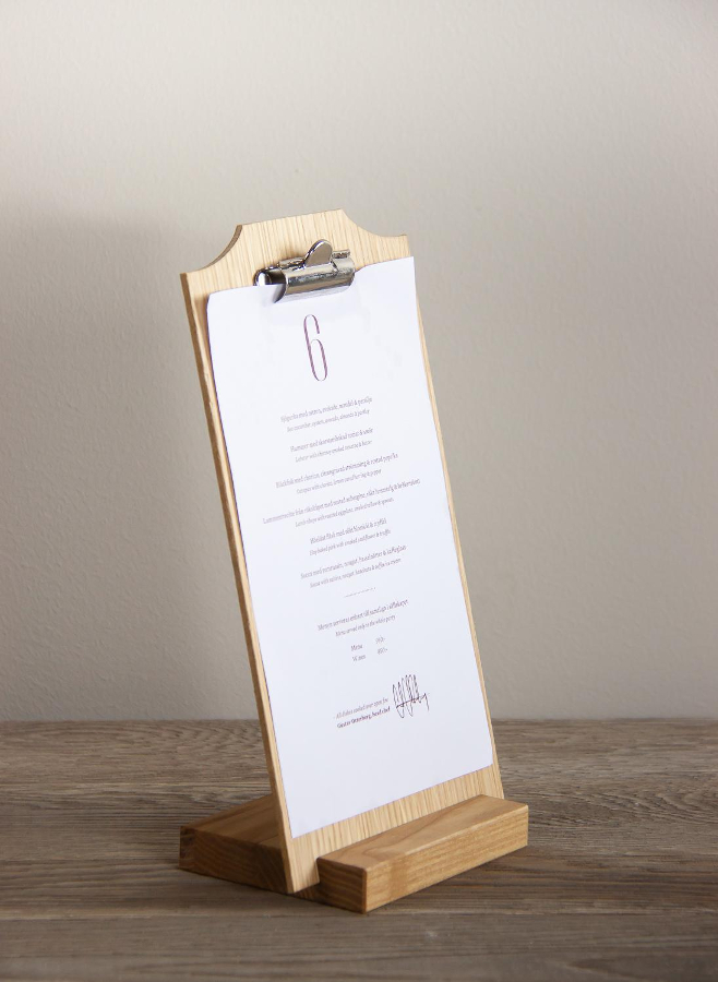 Det finns en menyhållare till denna menybräda som tillbehör som gör att menybrädan får en fot och blir en bordsskylt.