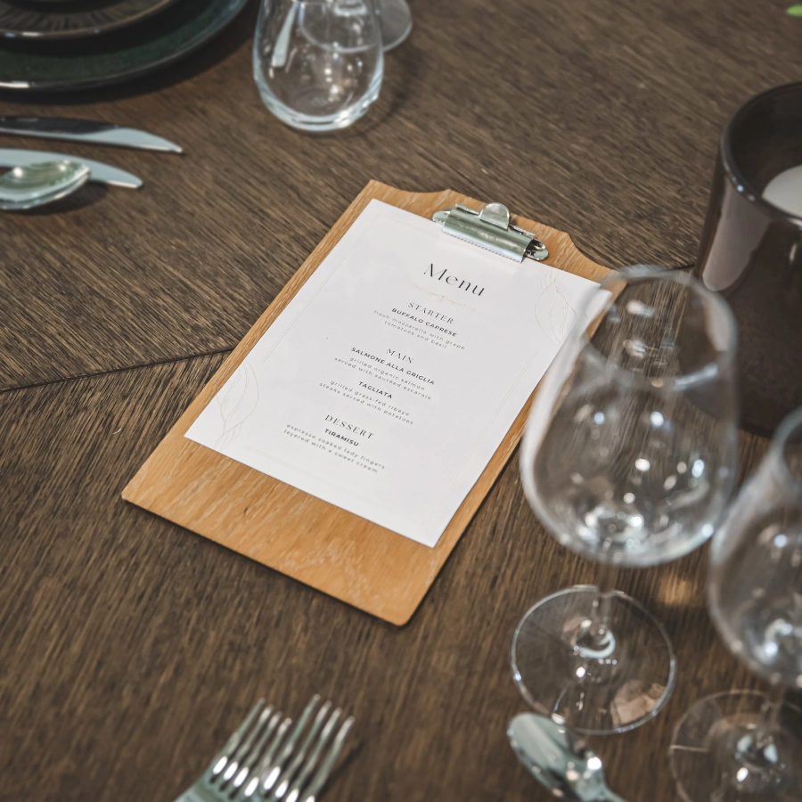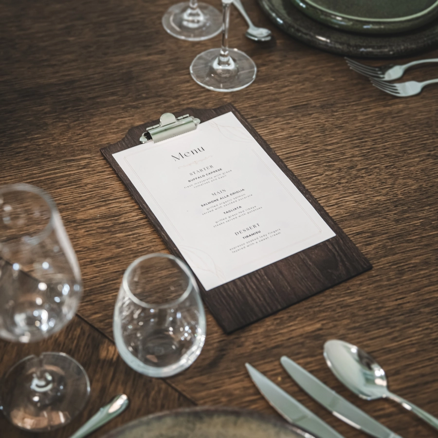 Om man väljer att komplettera med en menyhållare då kan man göra sin menybräda till en praktisk bordsskylt eller bordspratare.