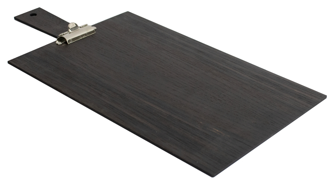 Menybräda med klämma i A4 format där brädan är tillverkad av ekfanér och som finns i olika färger. En menybräda som ingår i en serie där olika storlekar finns.