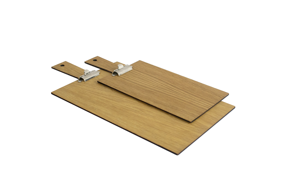 Menybräda med klämma i A5 format där brädan är tillverkad av ekfanér och som finns i olika färger. En menybräda som ingår i en serie där olika storlekar finns.