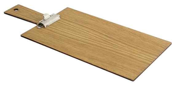 Brädan har handtag med hål som gör menybrädan upphängningsbar och gör att denna menybräda även kan fungera som väggskylt.