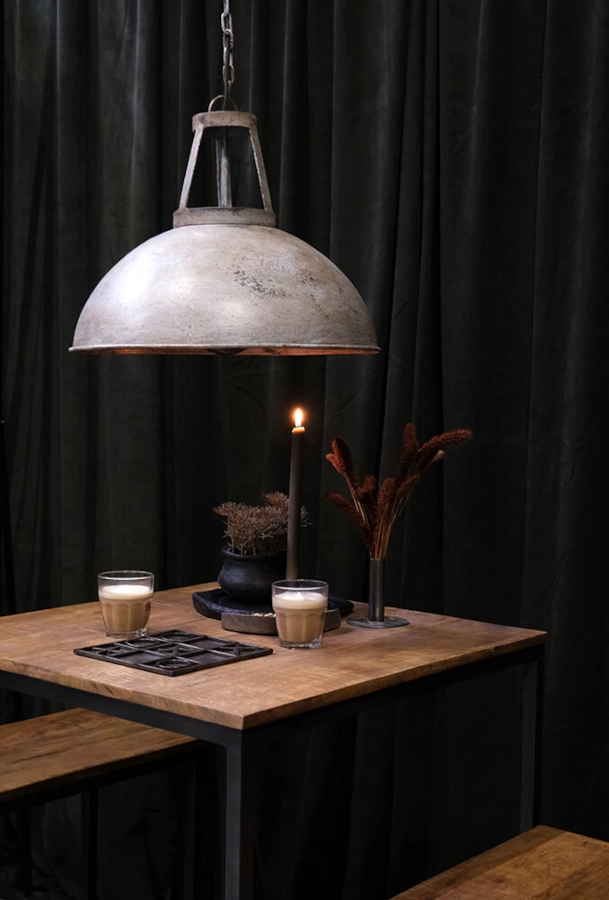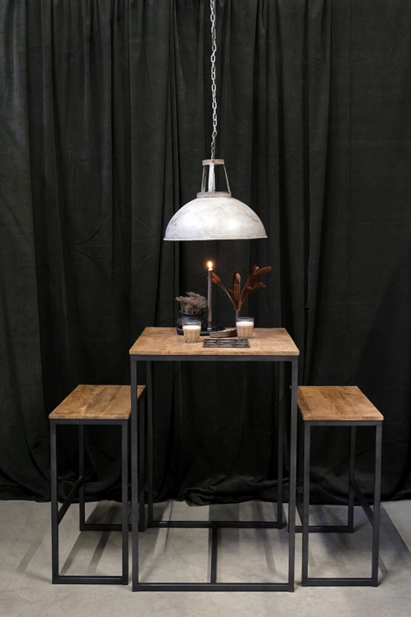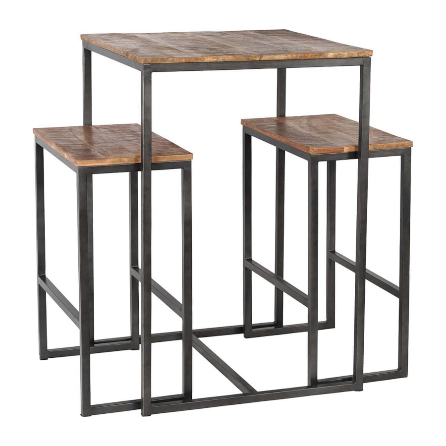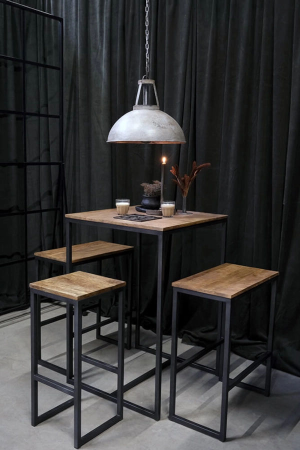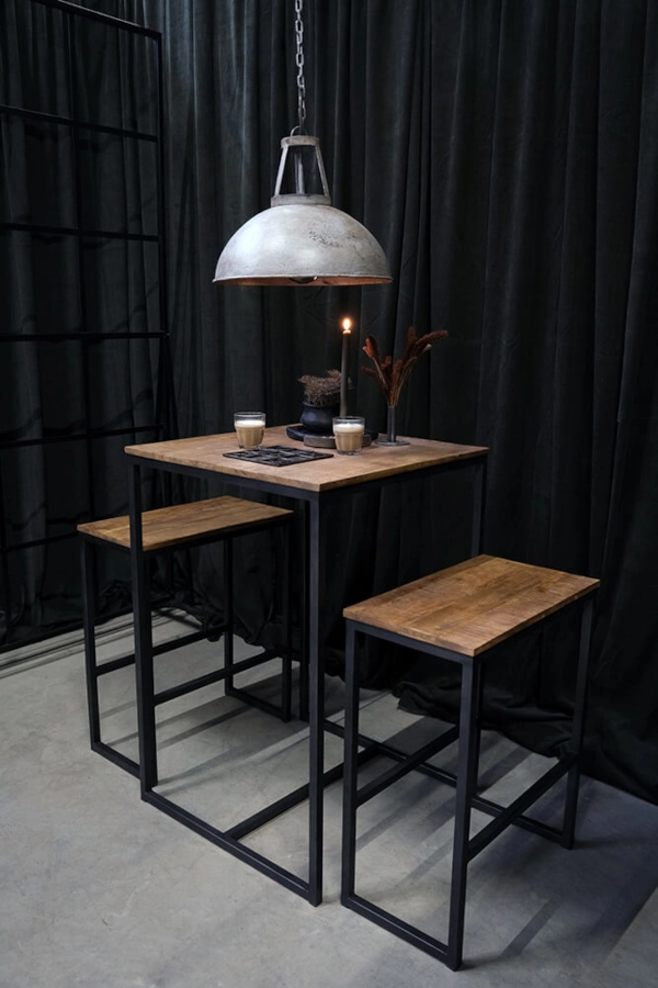 Bordsskivan och bänkarna är tillverkade av slitstarkt mangoträ med en vacker naturlig yta som skapar en varm kontrast till den råa mörkgrå järnramen. Bänkarna har fördelen att de enkelt kan skjutas in under bordet för att spara utrymme vilket gör setet perfekt i fikarum på kontor, i barer eller restauranger men även intressant i ett hem. Om man behöver fler sittplatser då är barpallen Esbjerg bra att komplettera med.
