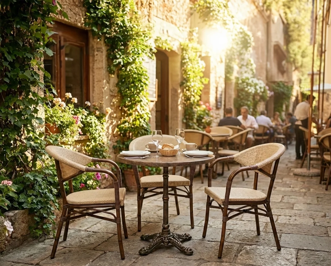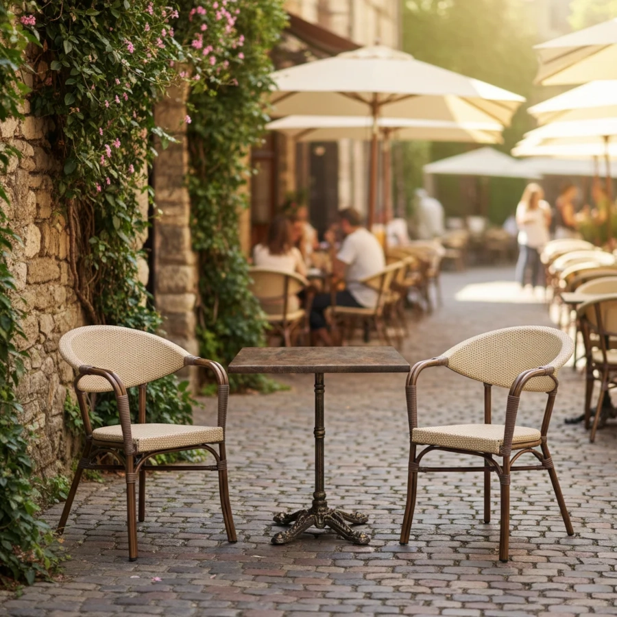 Monaco karmstol med klassisk bistro stil som har flätning av textilene. Karmstolarna ingår i serien Monaco där olika utföranden finns och där flätningen är av fiberrotting eller textilene. En serie med inspiration från de böljande stråken och vägarna i staden Monaco.