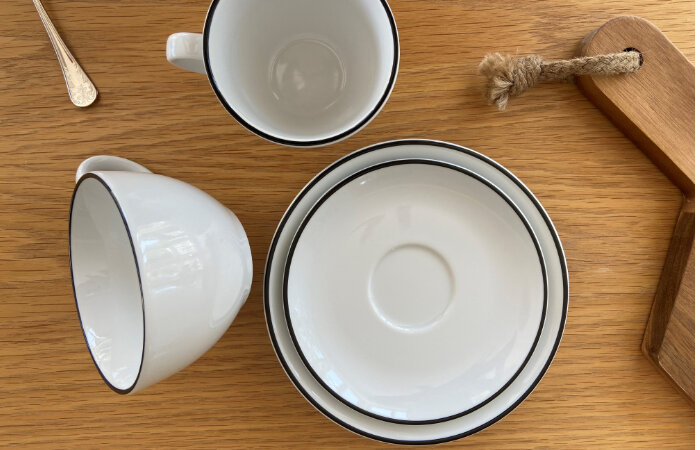 Nana med dekor svart rand är en vit kaffekopp som rymmer 25 cl med dekorerad kant som är tillverkad av fältspatporslin.