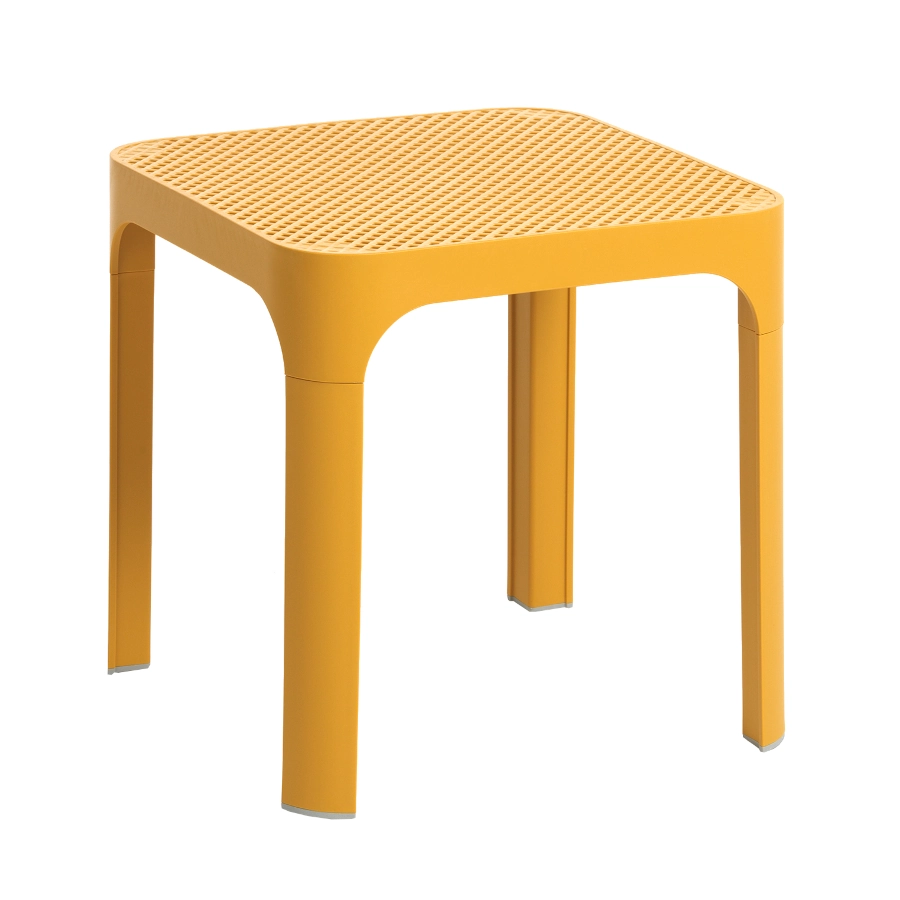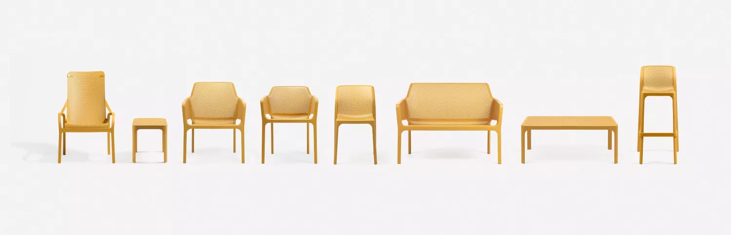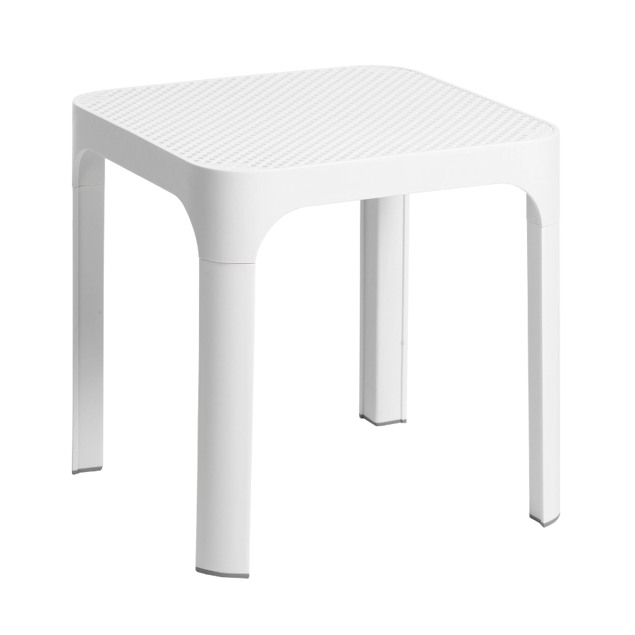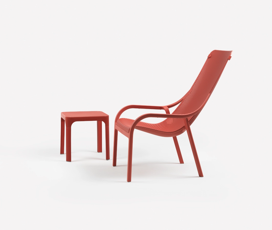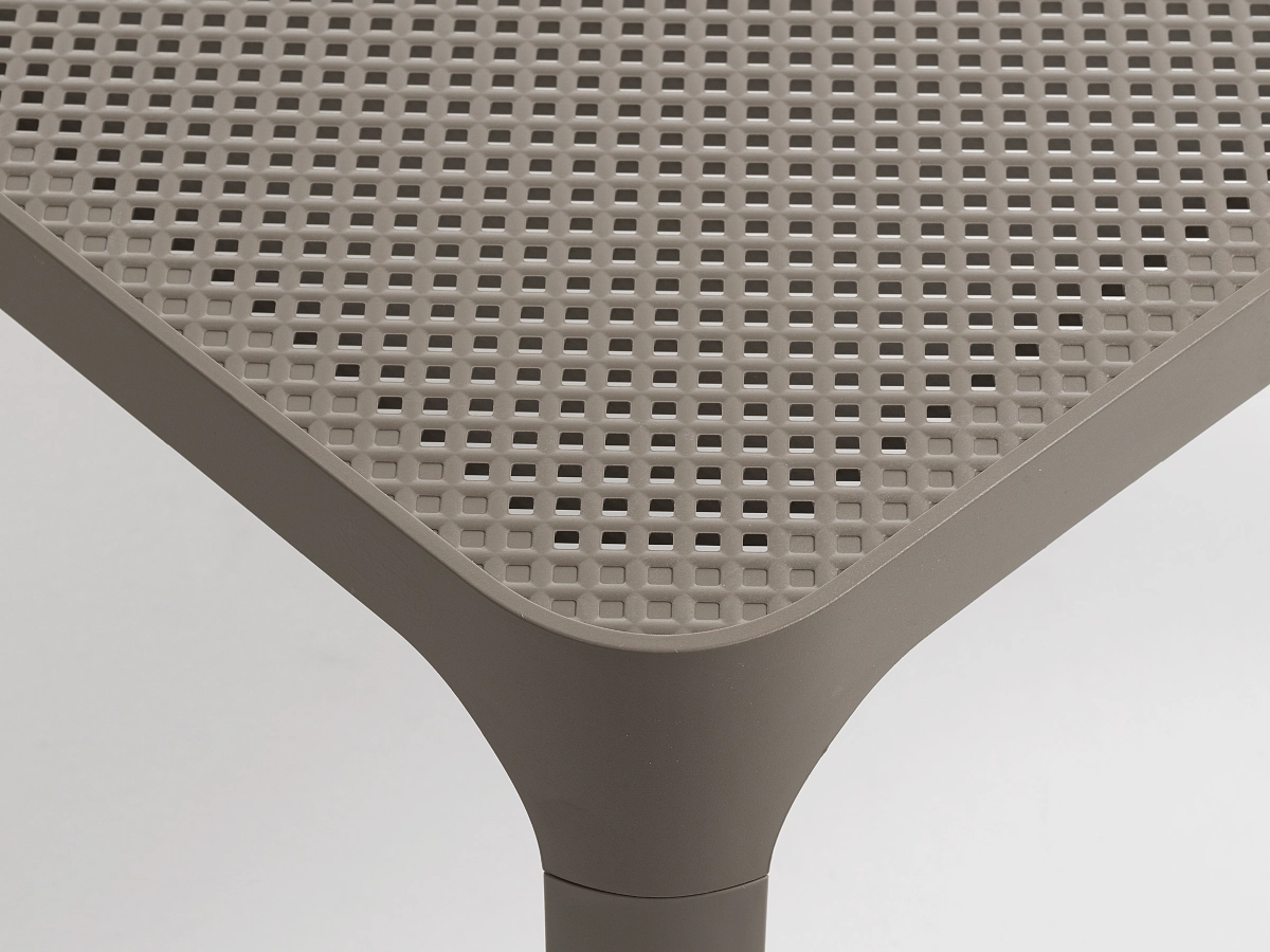 Net bord av plast med fyrkantig form och rundade hörn som har en modern design. Bordet ingår i serien Net som kännetecknas av sina fina linjer som är dekorerad med fyrkantiga hål. Hålen är inte bara dekorativa utan gör att möblerna i serien blir luftiga och vid regn så torkar de snabbare.