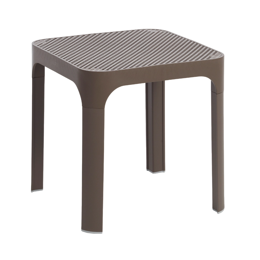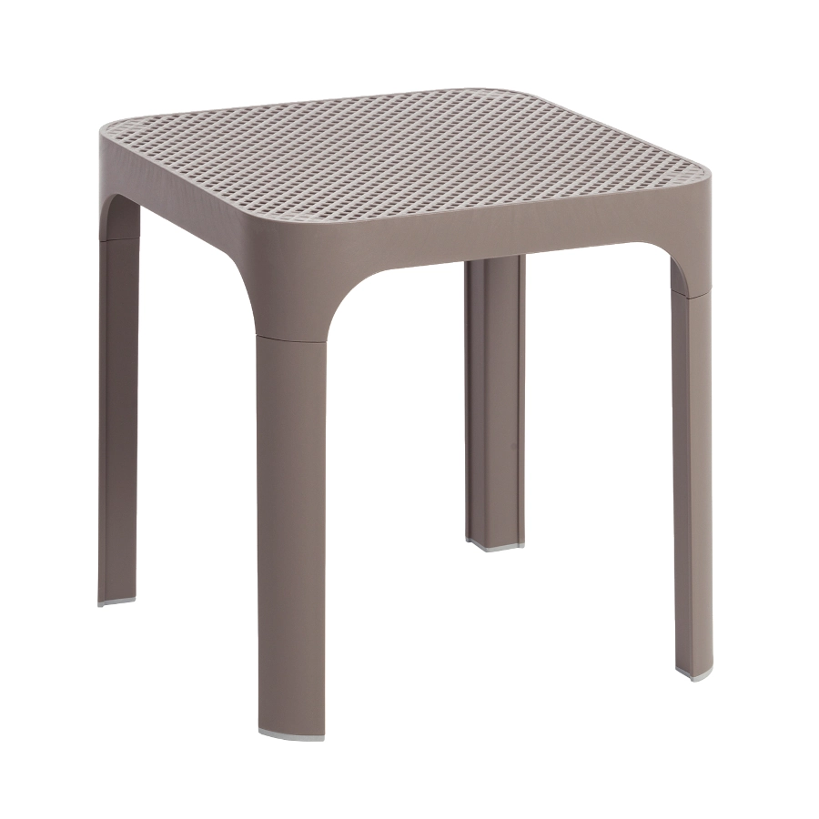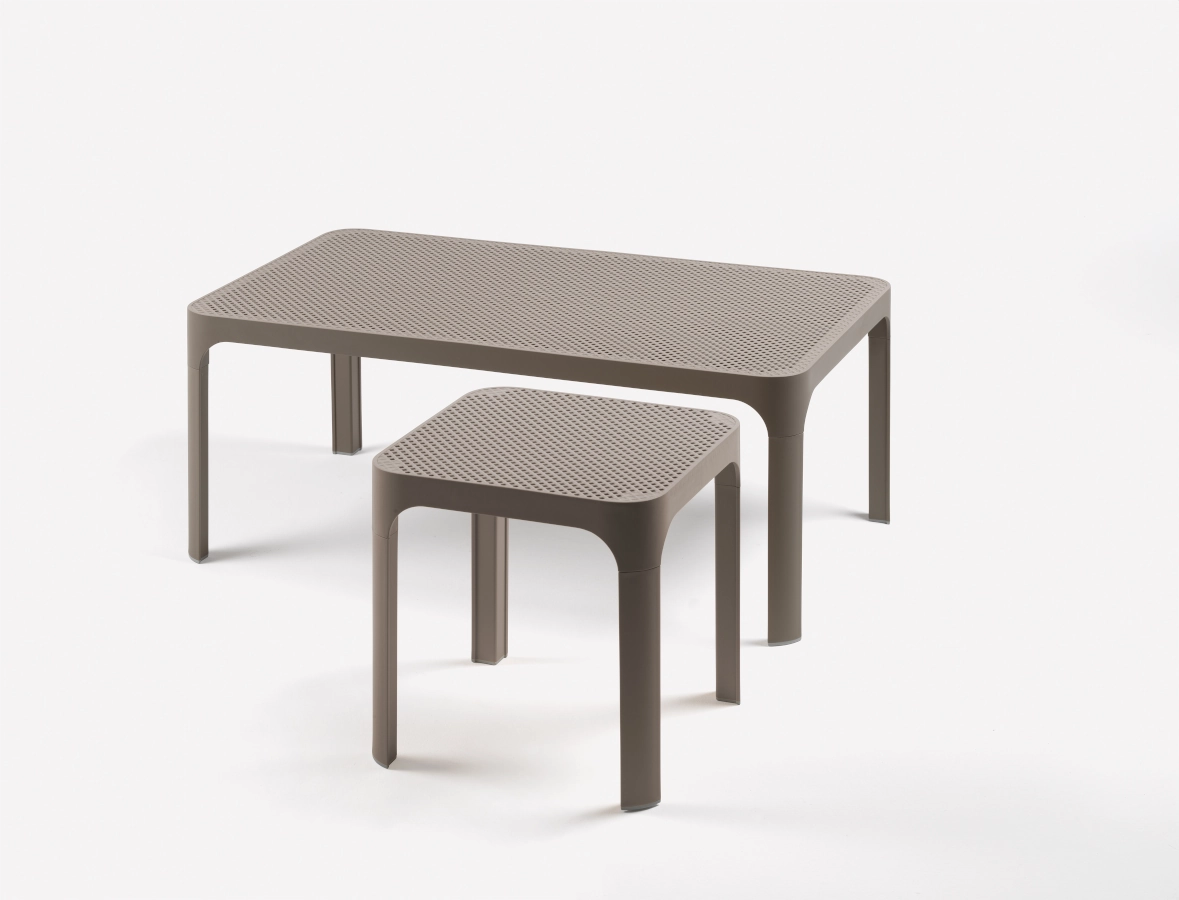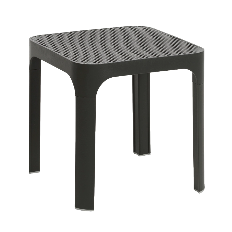 Net bord med perforerad bordsskiva som har låg höjd och passar bra som loungebord och soffbord i olika utemiljöer.