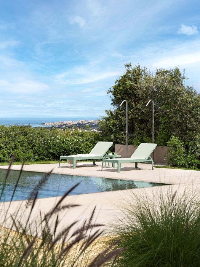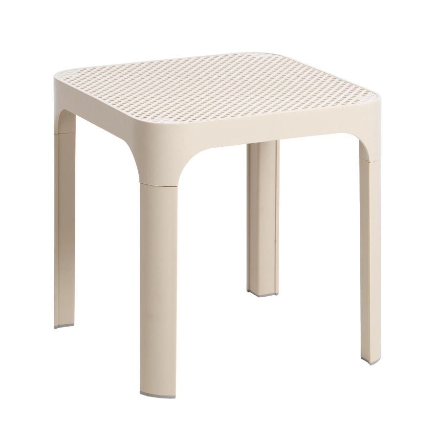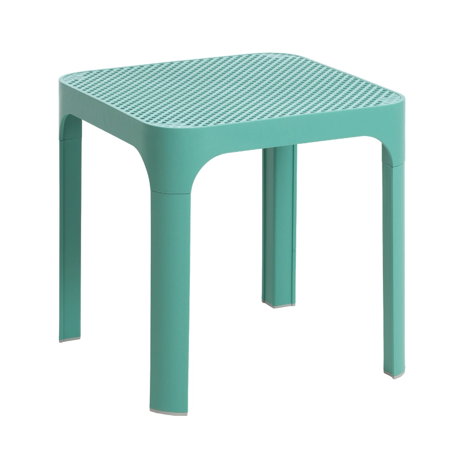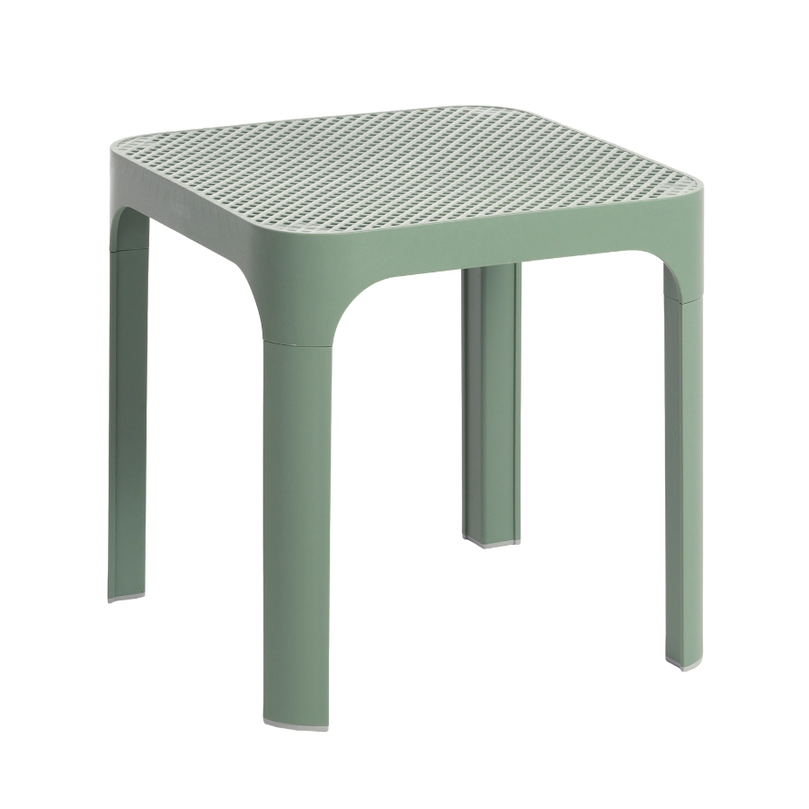Net bord med perforerad bordsskiva som har låg höjd och passar bra som loungebord och soffbord i olika utemiljöer.
