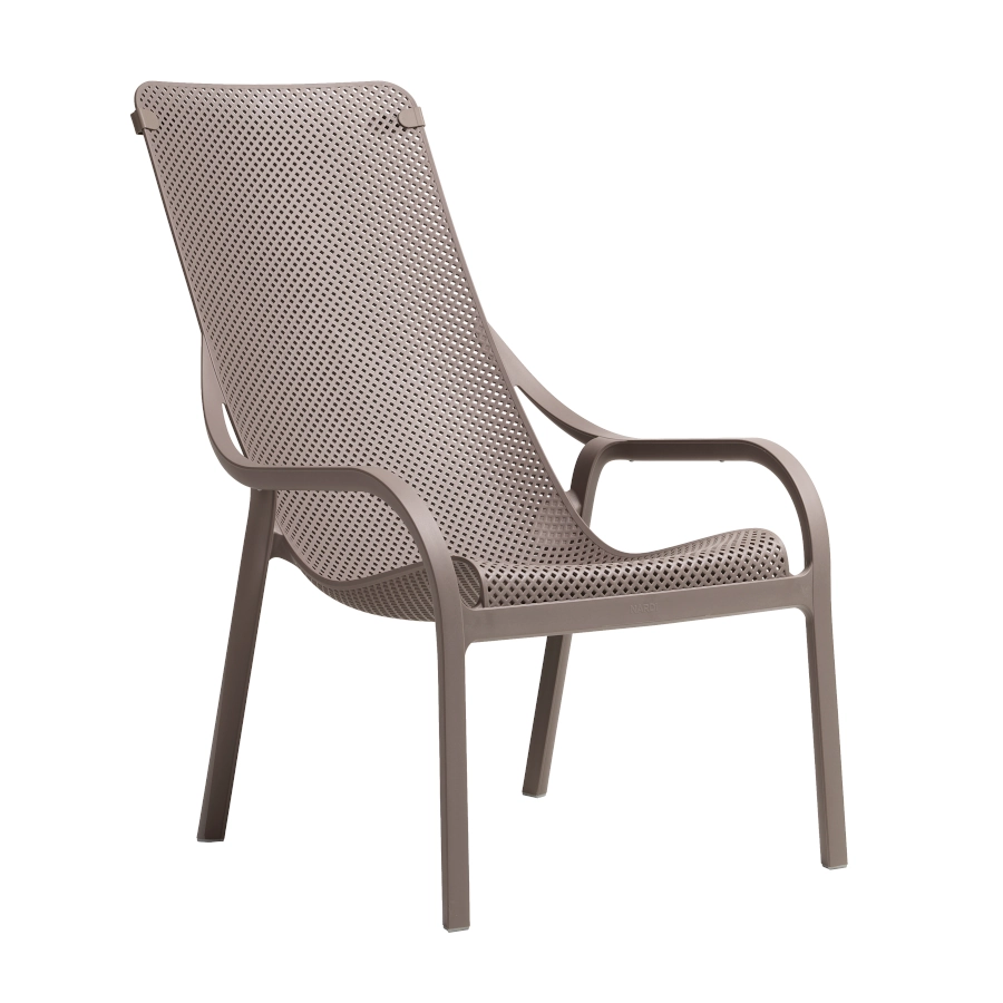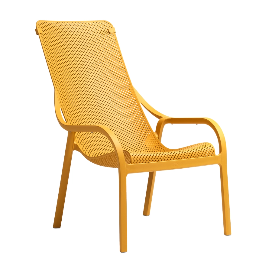 Net Lounge är loungestol av plast med en design som förmedlar en känsla av välbefinnande bara genom att titta på den. Loungestolen ingår i serien Net som kännetecknas av sina fina linjer som är dekorerad med fyrkantiga hål som bildar ett mönster i sitsen och ryggen. Hålen är inte bara dekorativa utan gör att möblerna i serien blir luftiga och vid regn så torkar de snabbare.