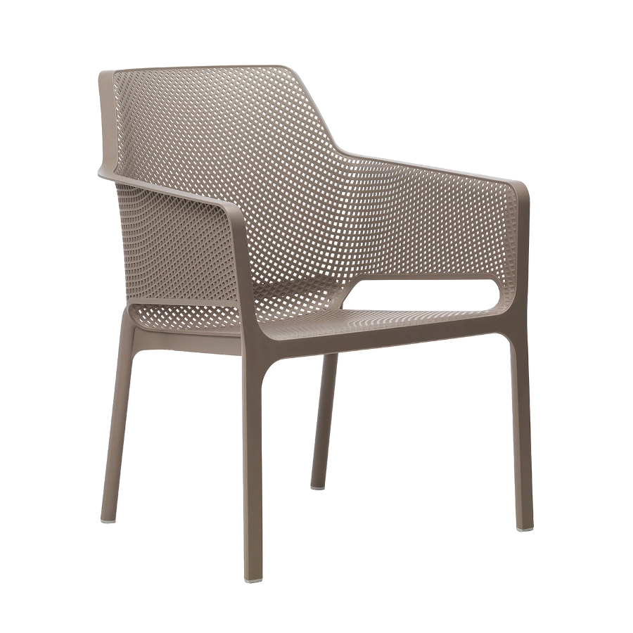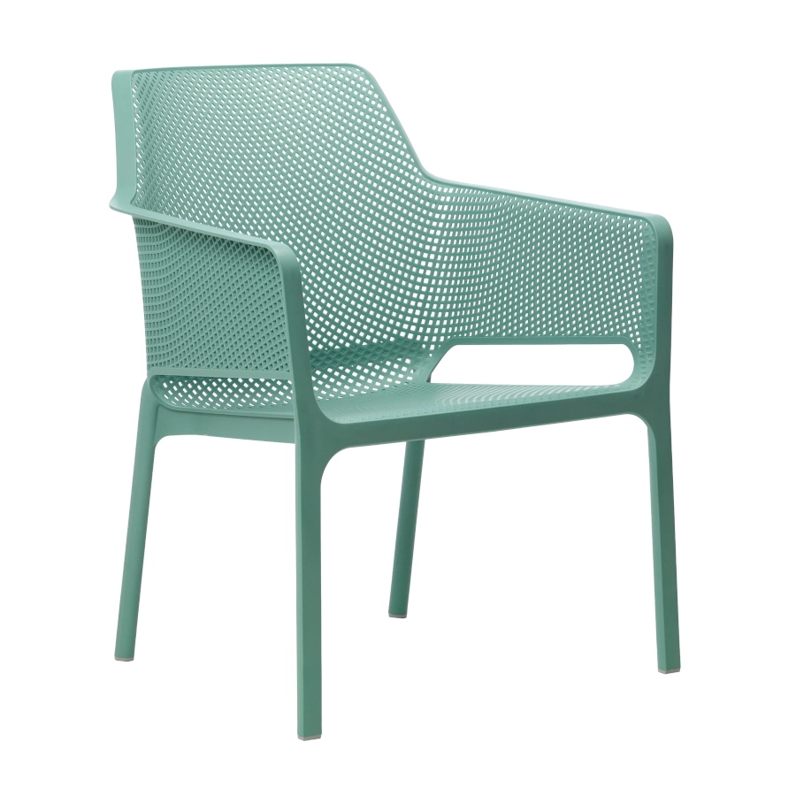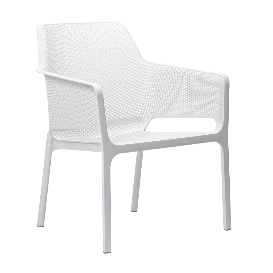 Net Relax är en fåtölj av plast som har en modern design och finns i olika färger. En fåtölj som ingår i serien Net som kännetecknas av sina fina linjer som är dekorerad med fyrkantiga hål som bildar ett mönster i sitsen och ryggen. Hålen är inte bara dekorativa utan gör att möblerna i serien blir luftiga och vid regn så torkar de snabbare.