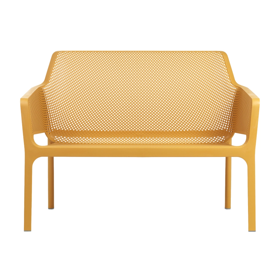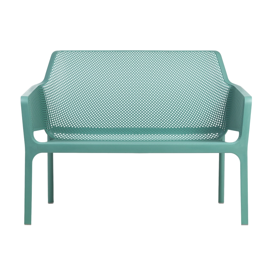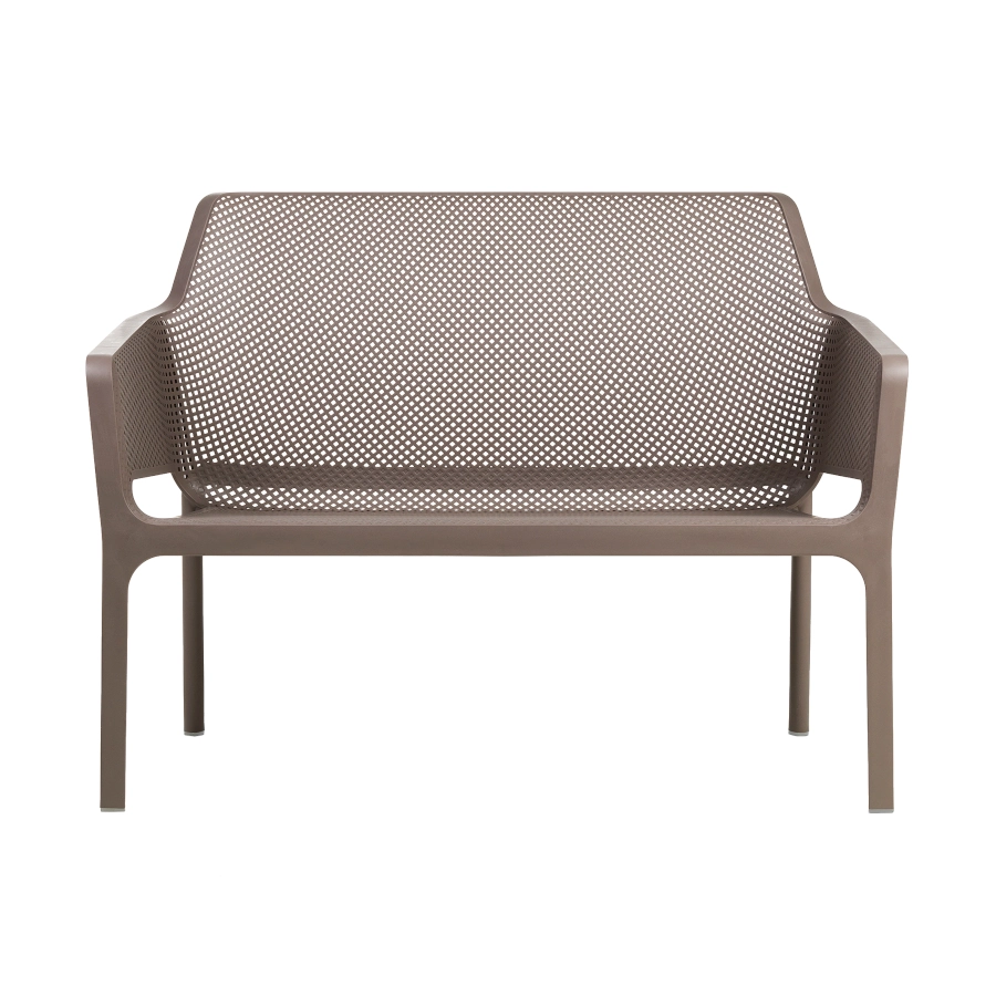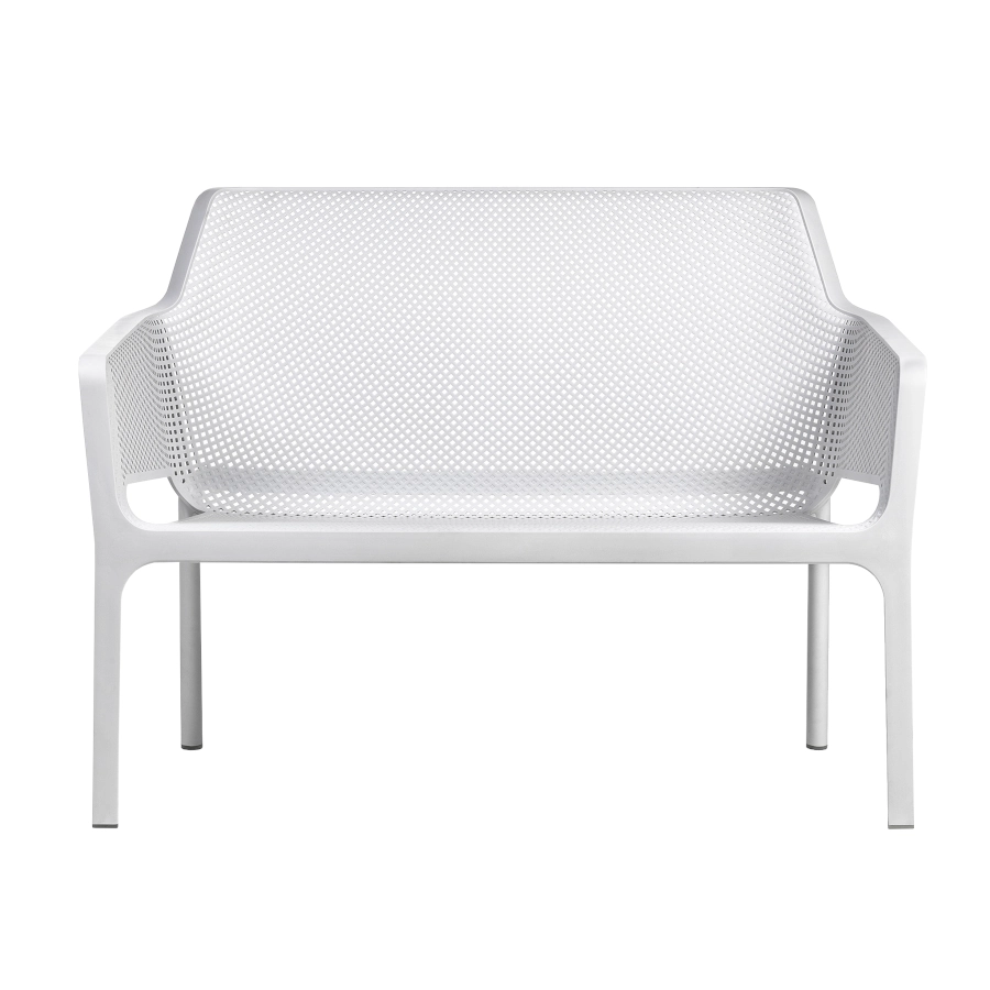 Net soffa med låg sitthöjd av plast som har en modern design och finns i olika färger. Soffan ingår i serien Net som kännetecknas av sina fina linjer som är dekorerad med fyrkantiga hål som bildar ett mönster i sitsen och ryggen. Hålen är inte bara dekorativa utan gör att möblerna i serien blir luftiga och vid regn så torkar de snabbare.