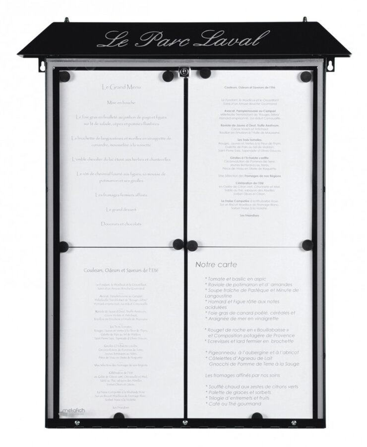 Menyskåpen i serien är av elektrogalvaniserad stål med dörr av plexiglas och där man fäster sitt budskap med magneter och som är låsbart. Menyskåpet levereras utan text på överdelen. Det här menyskåpet passar bra vid entrén för sitt café och restaurang där man kan visa upp sin meny.