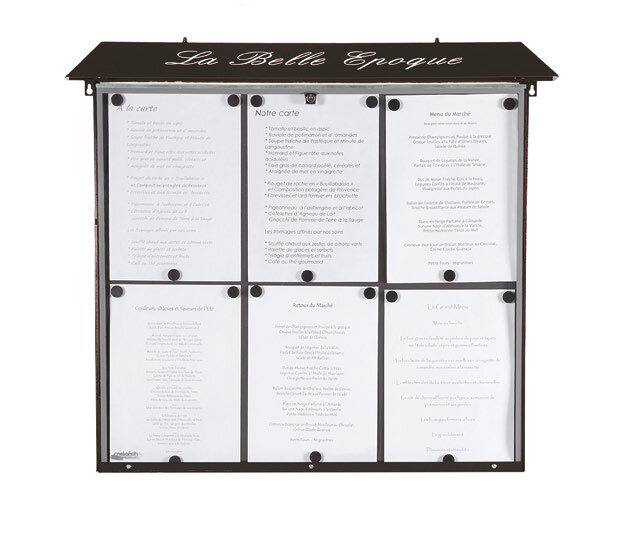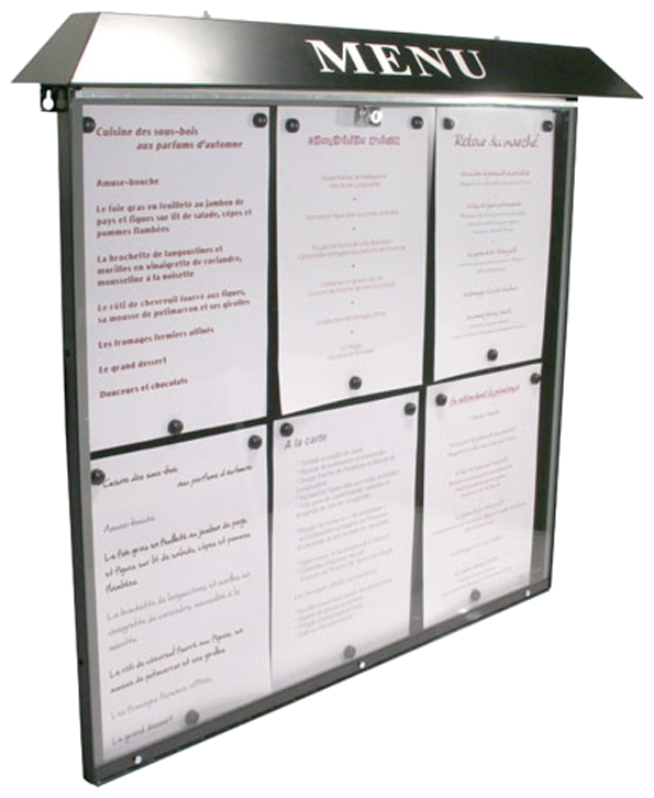 Menyskåpen i serien är av elektrogalvaniserad stål med dörr av plexiglas och där man fäster sitt budskap med magneter och som är låsbart. Menyskåpet levereras utan text på överdelen. Det här menyskåpet passar bra vid entrén för sitt café och restaurang där man kan visa upp sin meny.