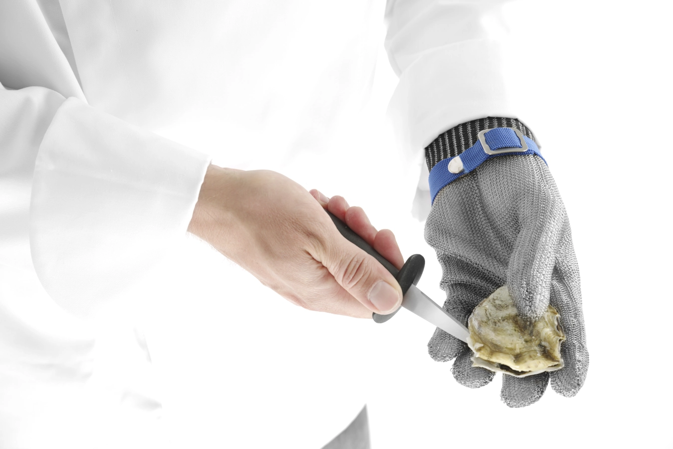 Ostronhandske som är bra vid öppning av ostron och både ger ett skydd men även bra grepp. Själva handsken består av 2 handskar; en HPPE innerhandske och en ringbrynjehanske. Den yttre handsken är av rostfritt stål som är slitstark, skärsäker och godkänd för kontakt med livsmedel. Medan den inre handsken är mjuk och skön.
