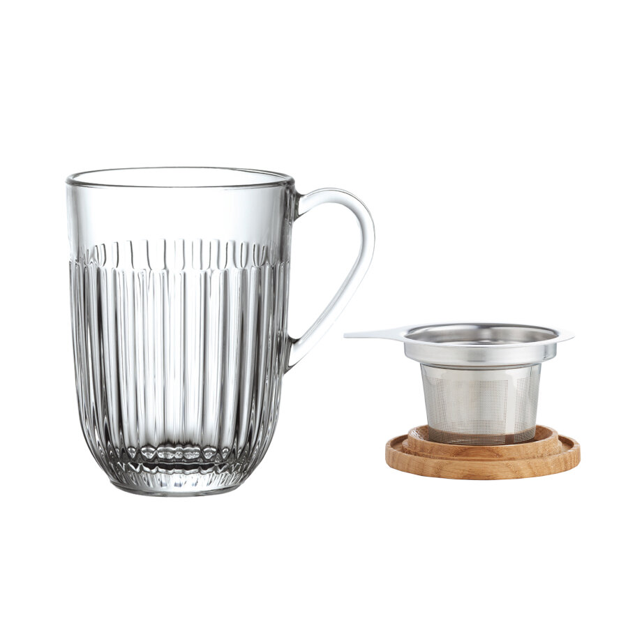 Ouessant temugg med tesil och lock som har elegant ribbad design. Muggen ingår i serien Ouessant som är en modern version av en älskad fransk design och är inspirerad av bretonska kanoter där Ouessant uttrycker havets hårda vågor. Det finns ett lyster som kommer fram tack vare de ribbade linjerna längs med glasen.